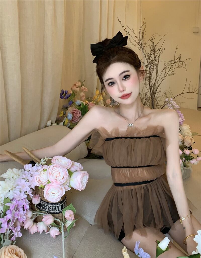 Sexy pure desire wind one-shoulder sleeveless mesh gauze tube top summer outside wearing sweet and spicy vest top women's fashion 大人ガーリー スウィート キュート カジュアル サマー 夏物 メッシュ ノースリーブ ピュア nana1405898220 | modepoisson