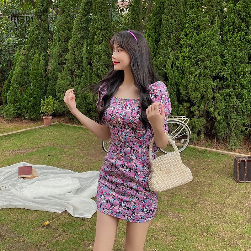 French gentle wind retro floral sexy backless bow skirt summer square collar short-sleeved purple dress female リボン レトロ サマー 夏物 花柄 スカート パープル スクウェア nana51352173085 | modepoisson