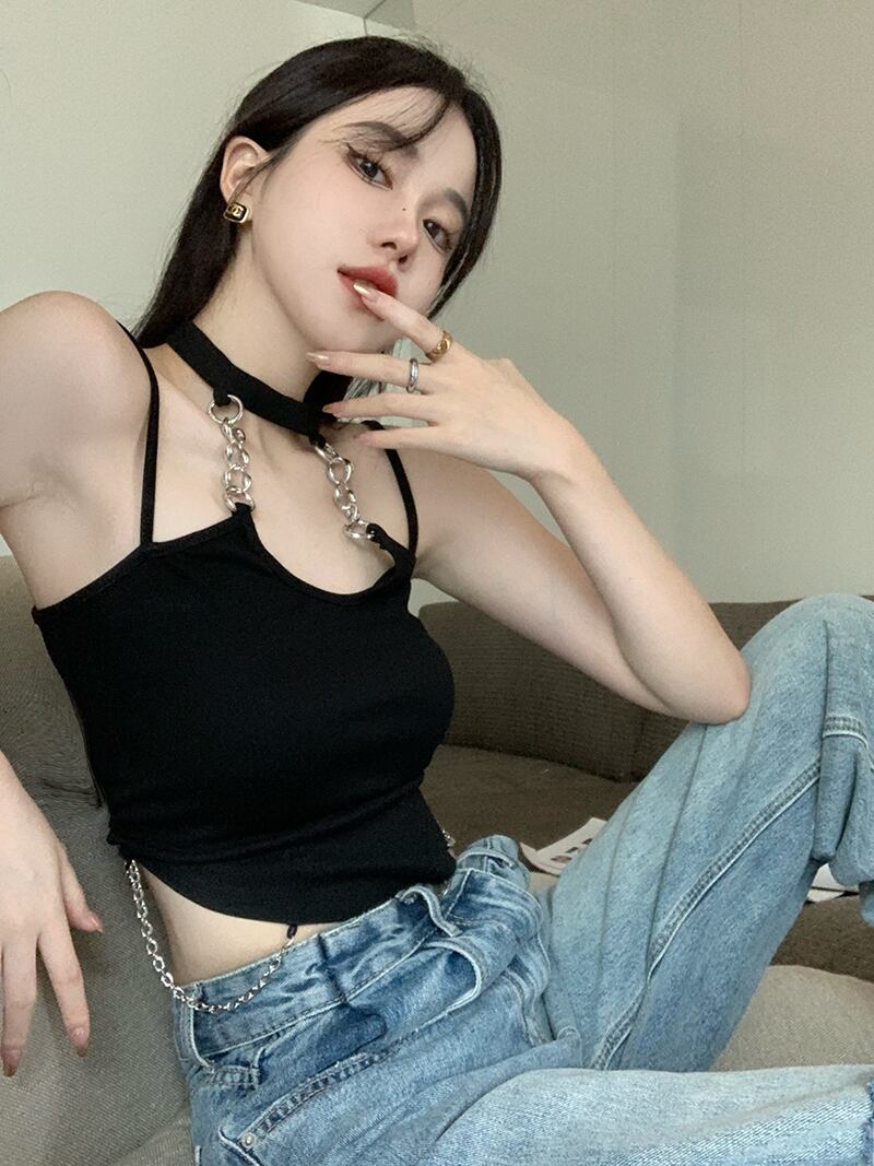 Hanging neck pure desire style sexy sleeveless black hollow camisole summer new short style inner top female ショート ブラック サマー 夏物 ノースリーブ ピュア nana49881599801 | modepoisson