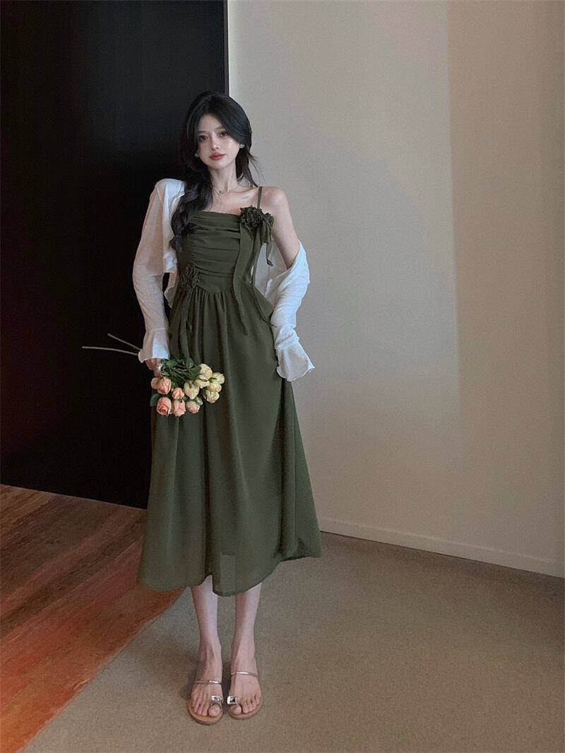 French sweet waist small niche green chiffon suspender dress sunscreen cardigan summer new two-piece suit female シフォン 大人ガーリー スウィート キュート カジュアル カーディガン サマー 夏物 グリーン nana51929784834 | modepoisson