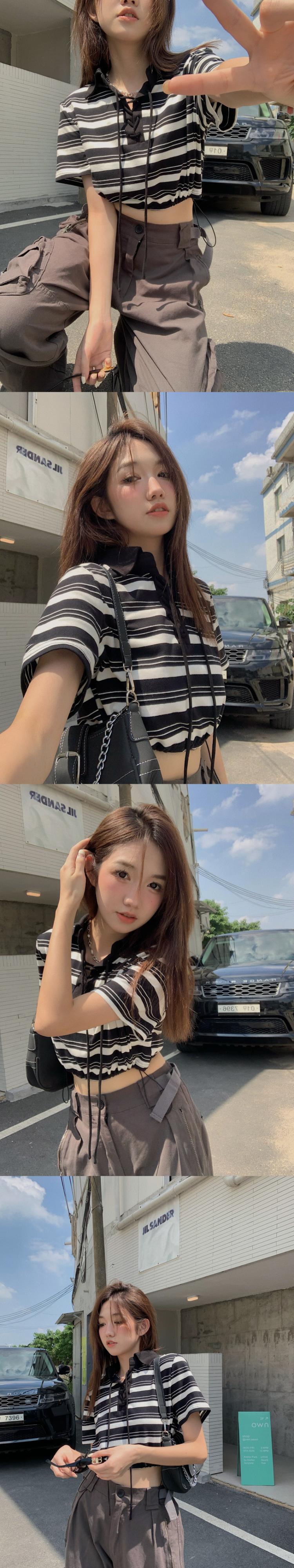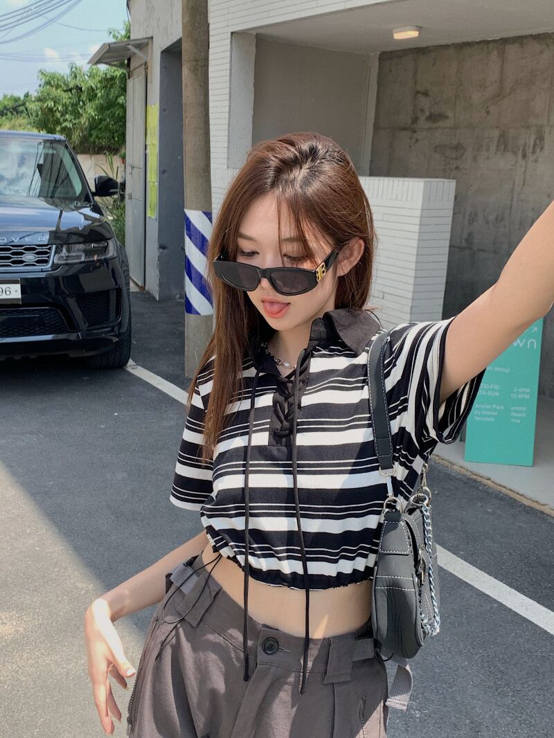 polo collar short striped t-shirt 2022 summer new niche design chic unique short-sleeved top women's clothing ショート サマー 夏物 ストライプ Tシャツ nana39998035940 | modepoisson