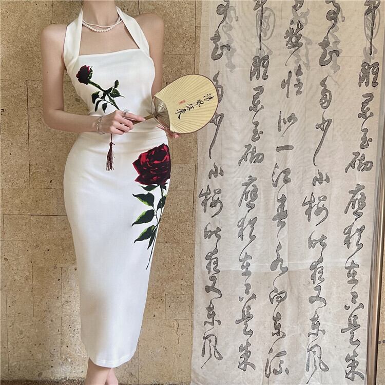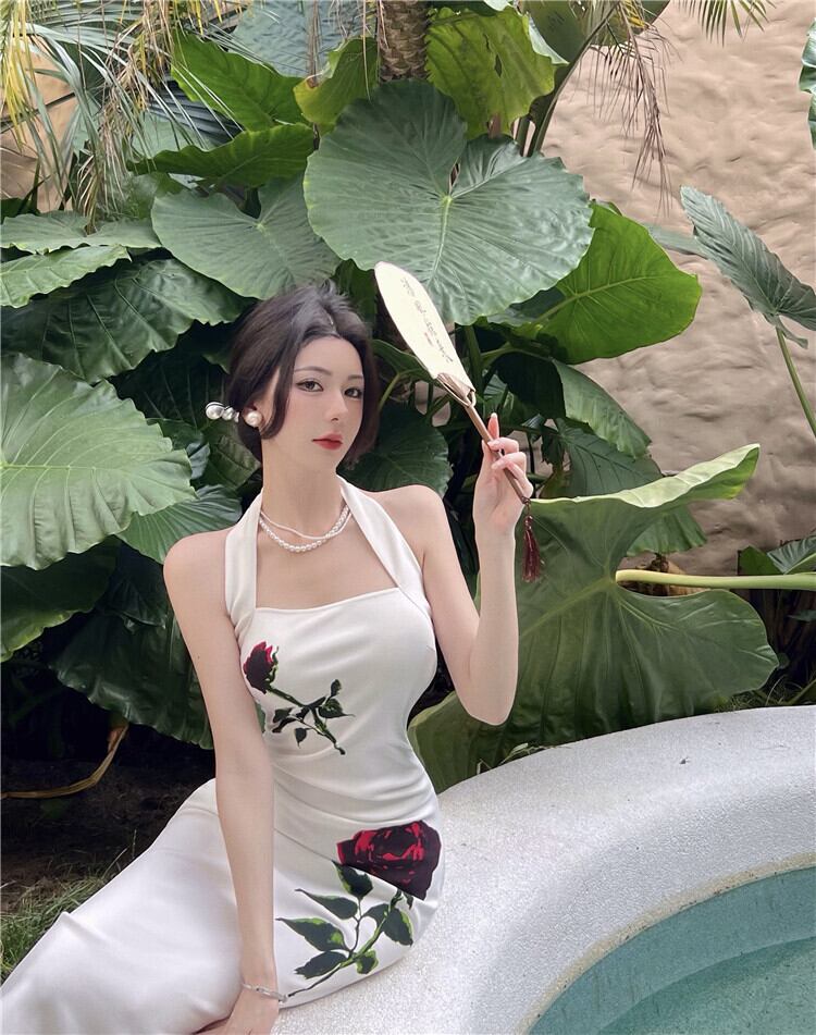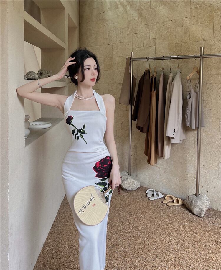 French rose print halter neck open back mid-length slit dress women's 2022 summer new temperament long skirt ロング サマー 夏物 スカート nana49668195871 | modepoisson