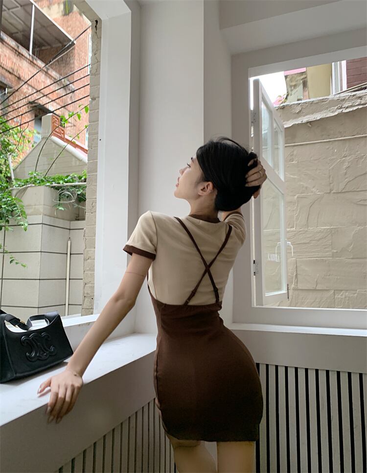 2022 summer new short letter contrast color t-shirt sexy bag hip suspender dress two-piece suit female ショート サマー 夏物 Tシャツ nana17708758878 | modepoisson
