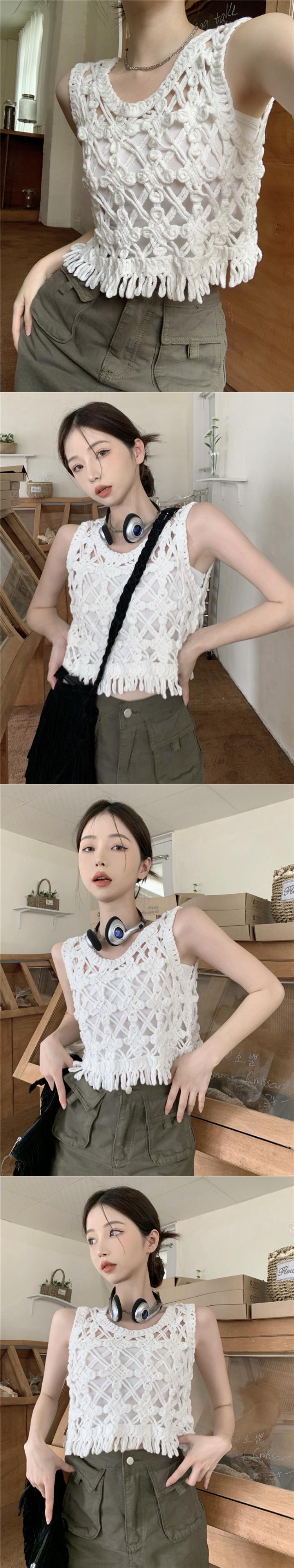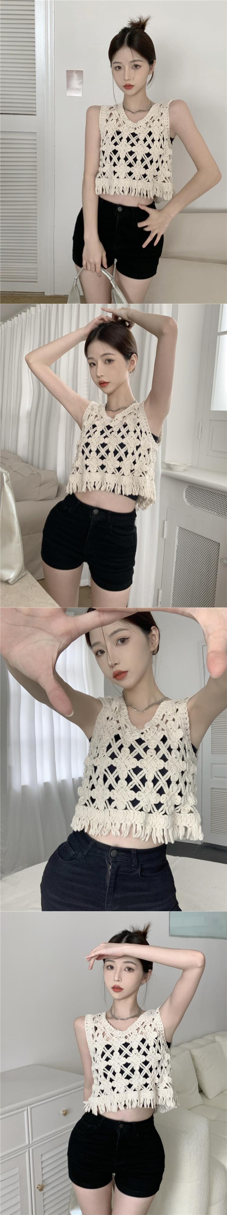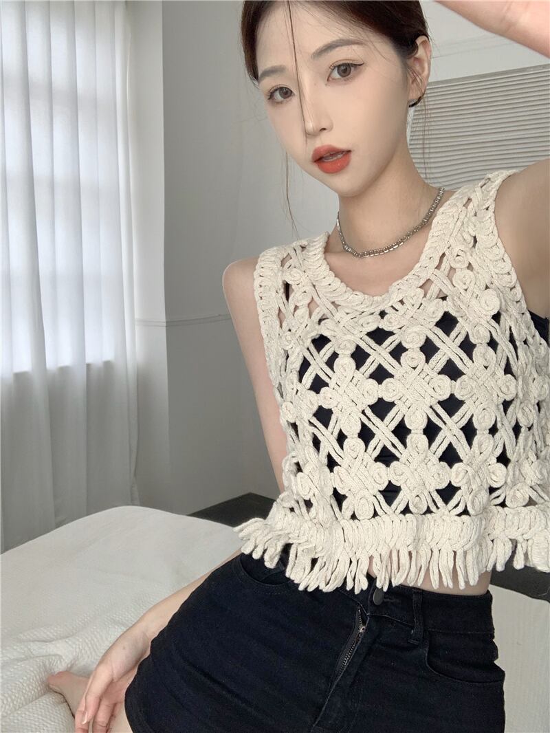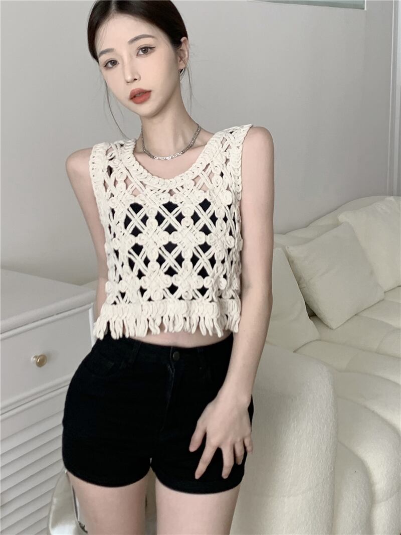 Summer retro knitted sweater vest vest blouse sleeveless v-neck design feeling small outside wear short top women's clothing ショート レトロ ブラウス サマー 夏物 ノースリーブ Vネック nana84302526199 | modepoisson