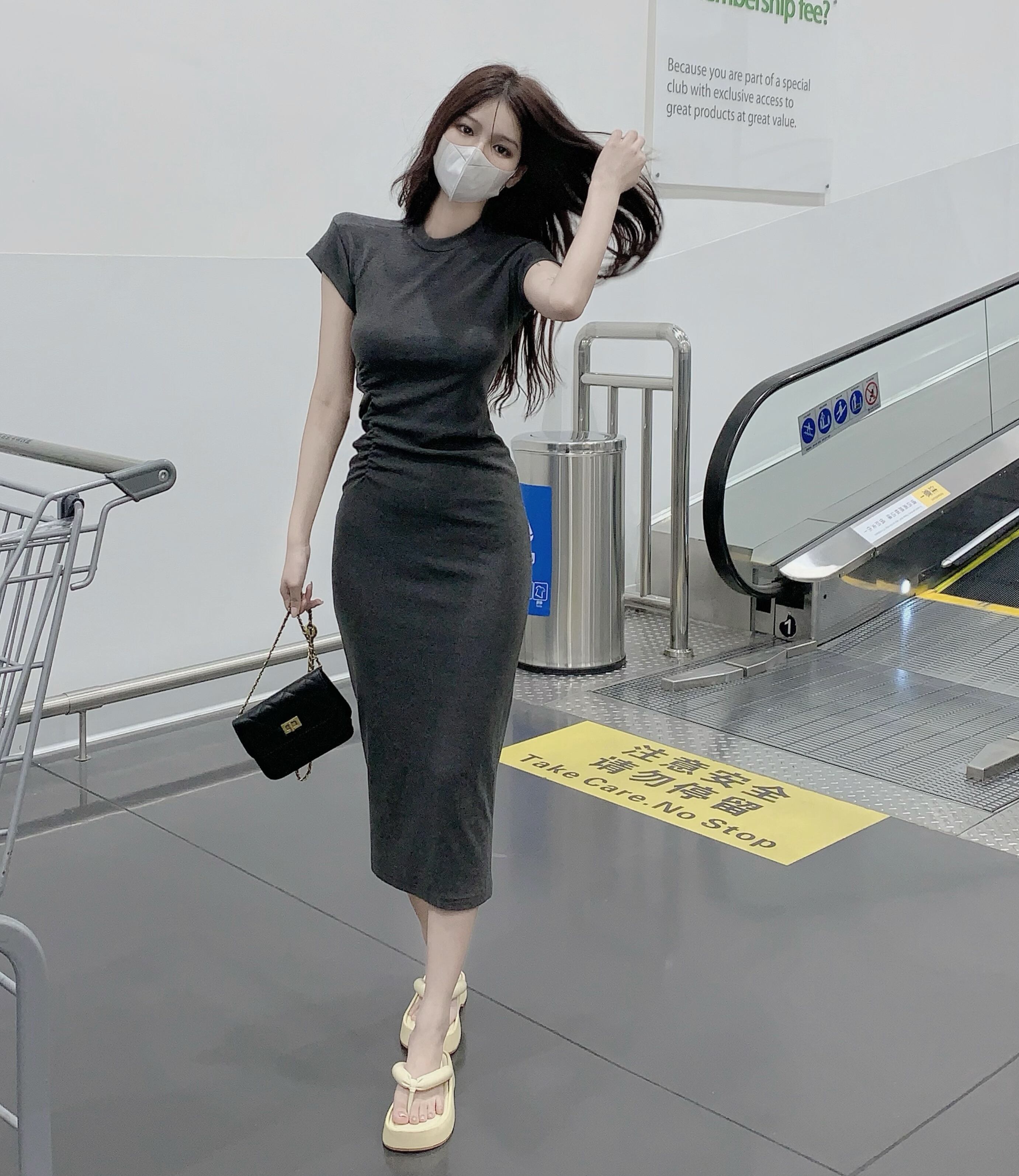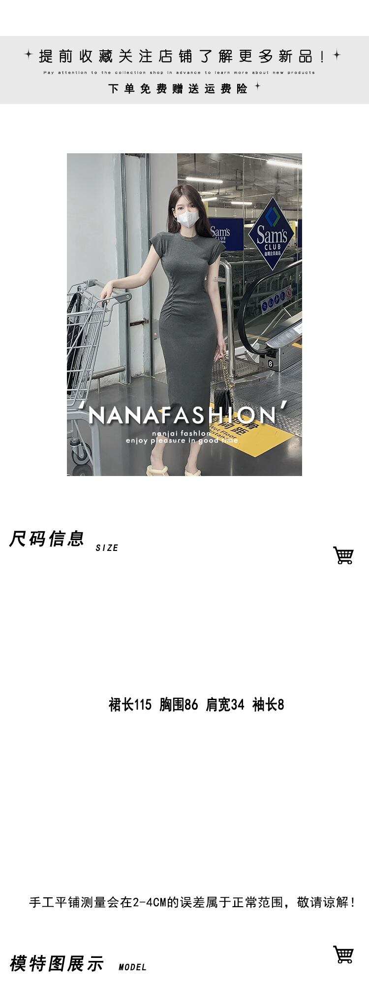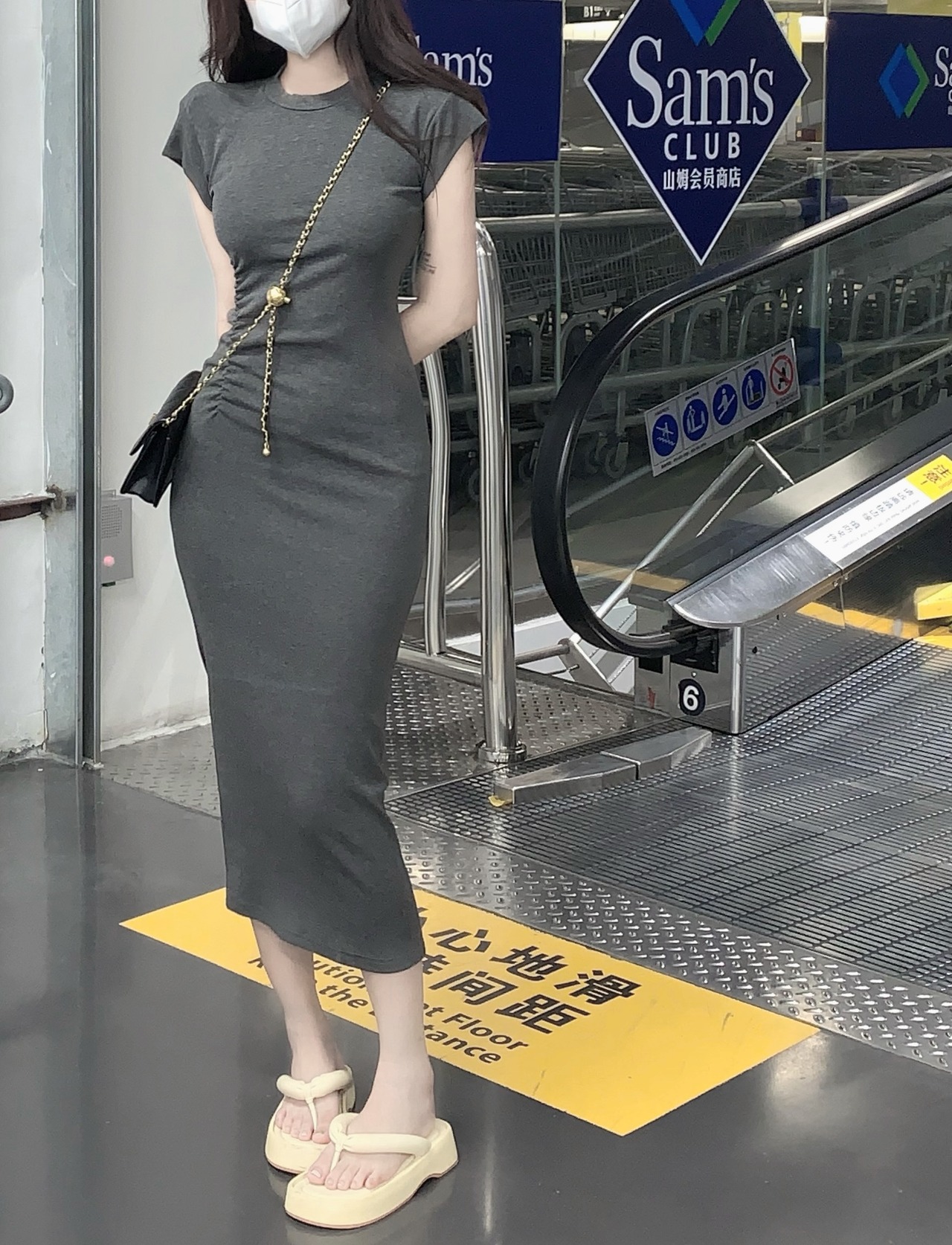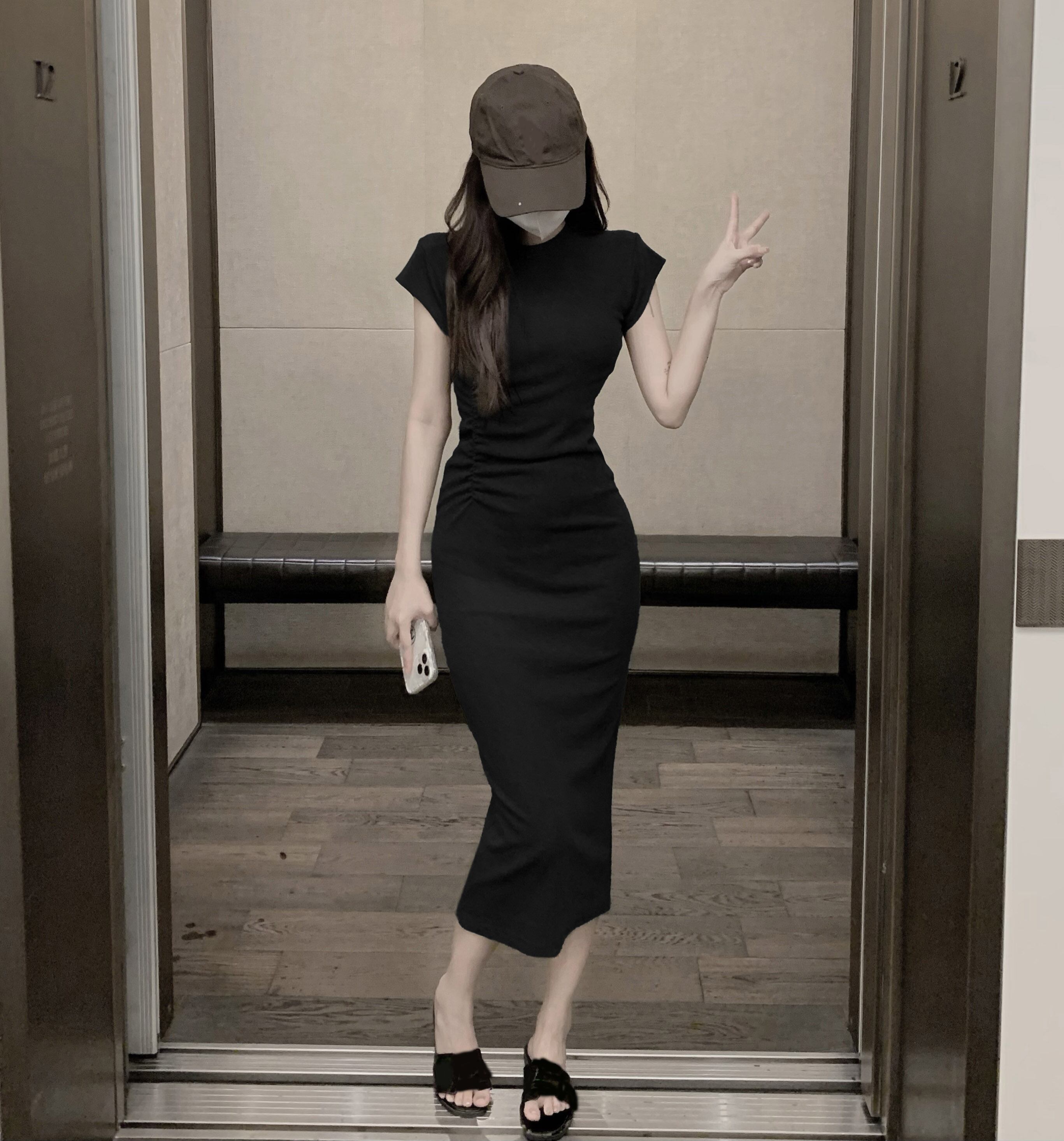 Solid color bag hips slim fit knitted short-sleeved dress women's 2022 summer new French temperament long skirt ロング サマー 夏物 スリムヒップ スカート スリム ソリッドカラー nana60757993441 | modepoisson