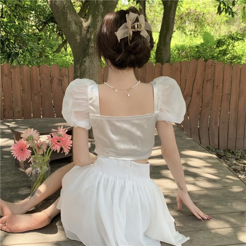 Skirt suit 2022 summer new fashion French puff sleeve top high waist pearl chiffon skirt women ハイウェスト シフォン サマー 夏物 スカート パール 真珠 nana97607624923 | modepoisson