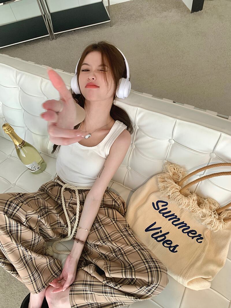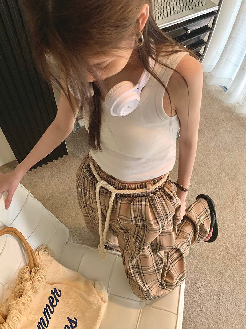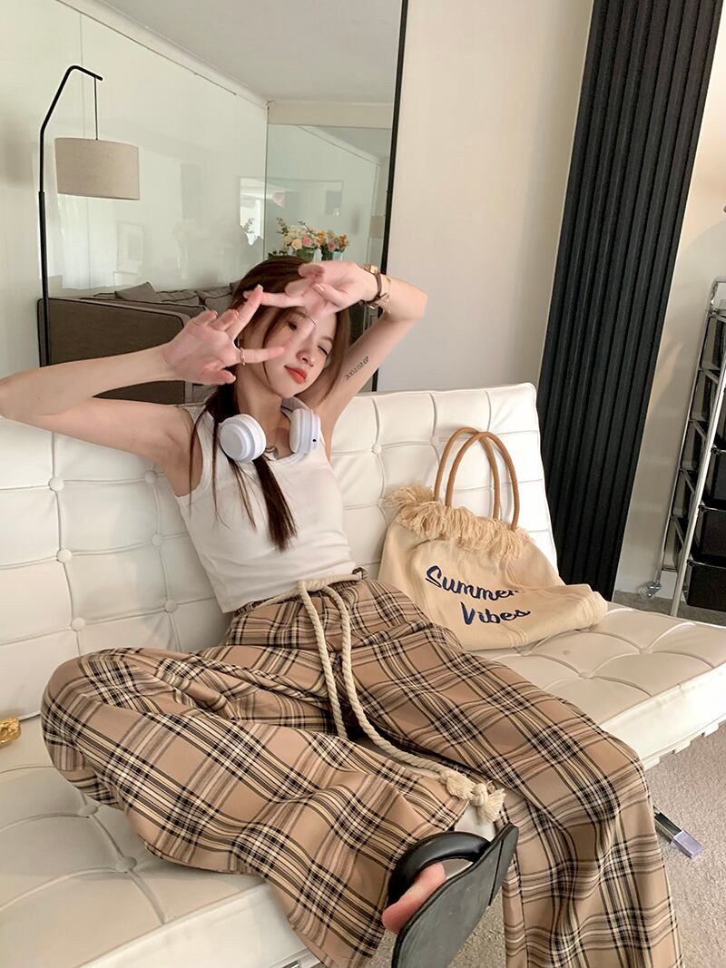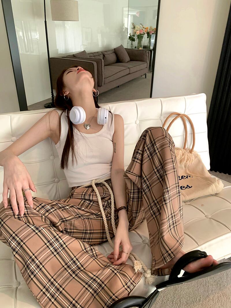 American retro high-waisted plaid casual pants 2022 summer new slim vertical straight tube loose wide-leg trousers women レトロ カジュアル サマー 夏物 スリム nana58193577891 | modepoisson