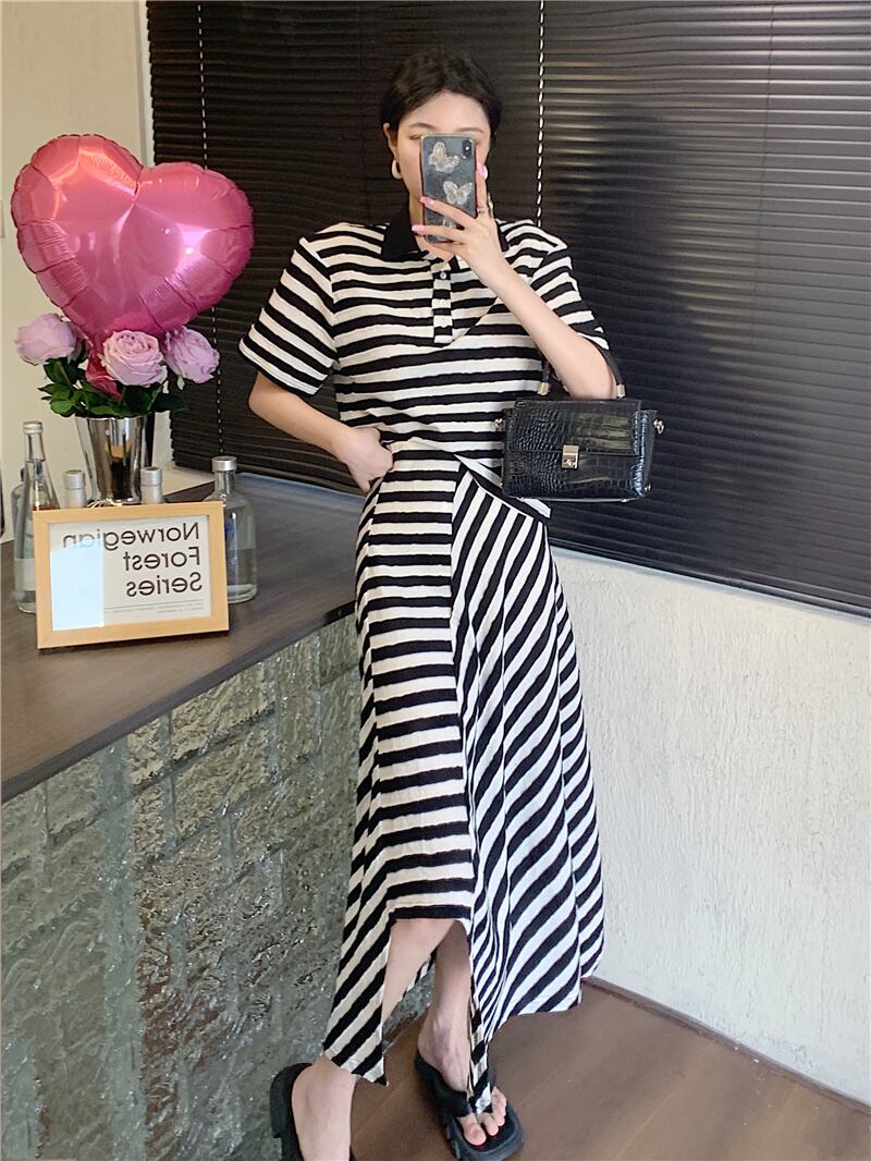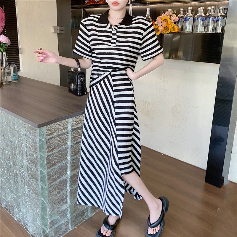 2022 summer new Hong Kong-style retro striped polo shirt mid-length skirt casual style two-piece suit women レトロ カジュアル サマー 夏物 スカート ストライプ nana71265806819 | modepoisson