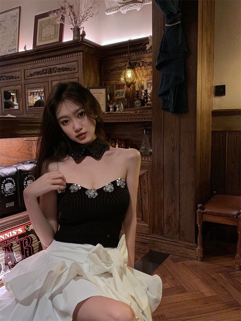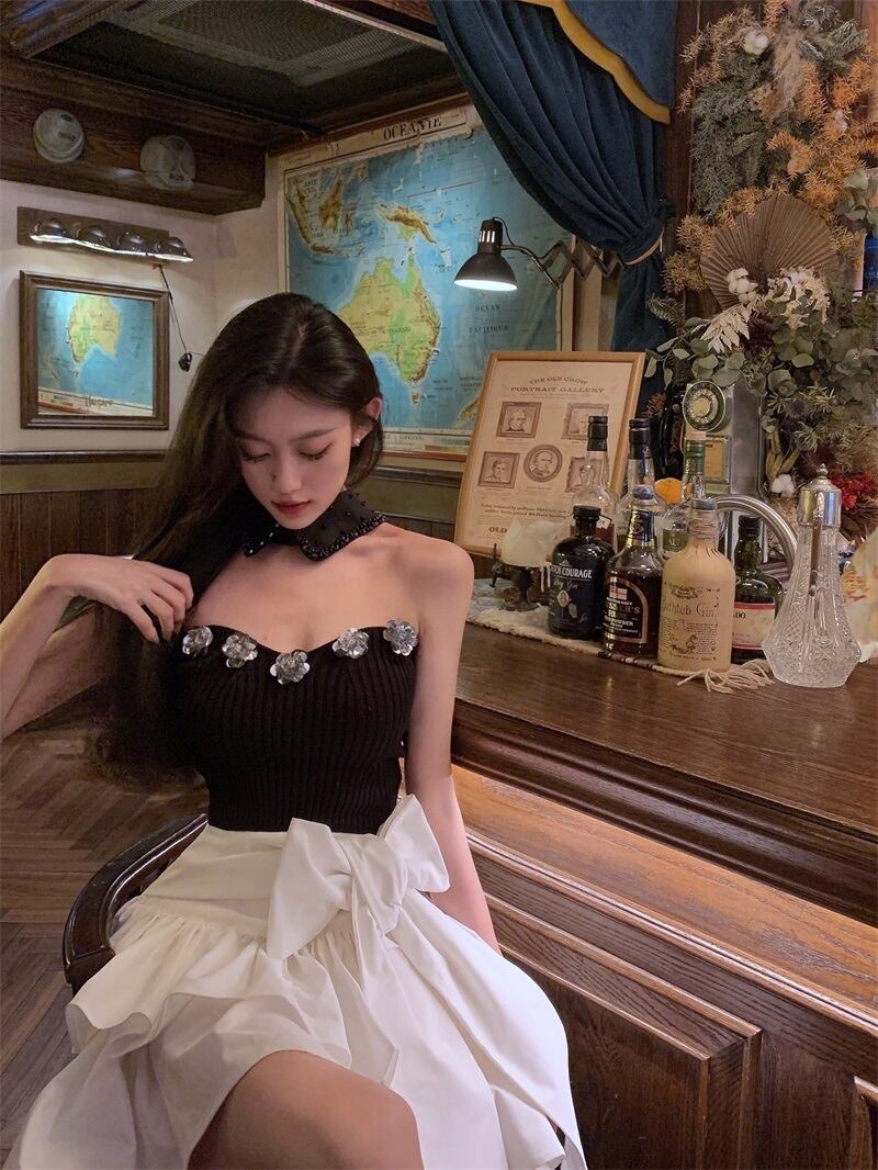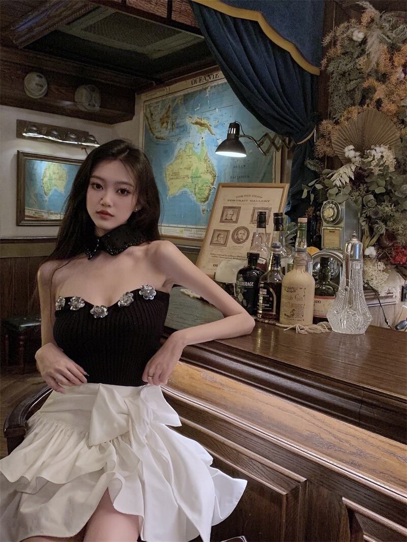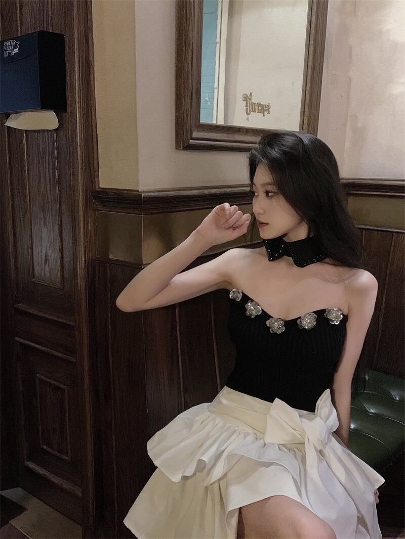 Summer suit women's 2022 new knitted flower tube top top design fluffy skirt two-piece set ふわふわ サマー 夏物 スカート フラワーデザイン nana8486204910 | modepoisson