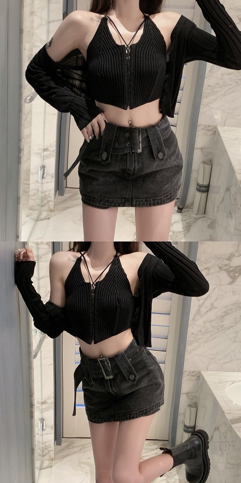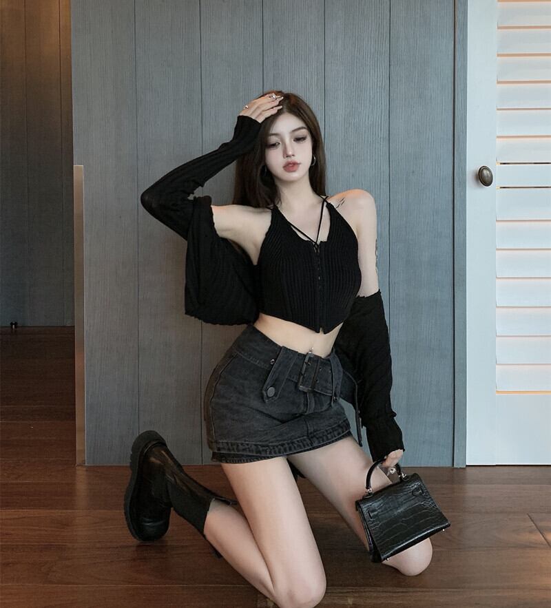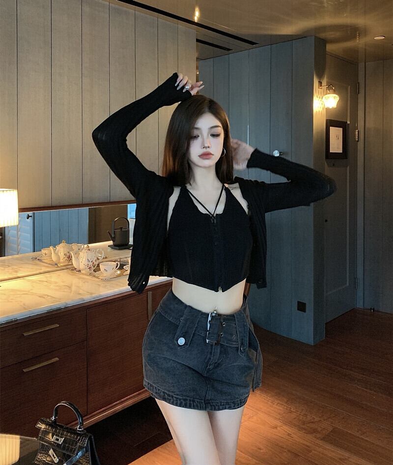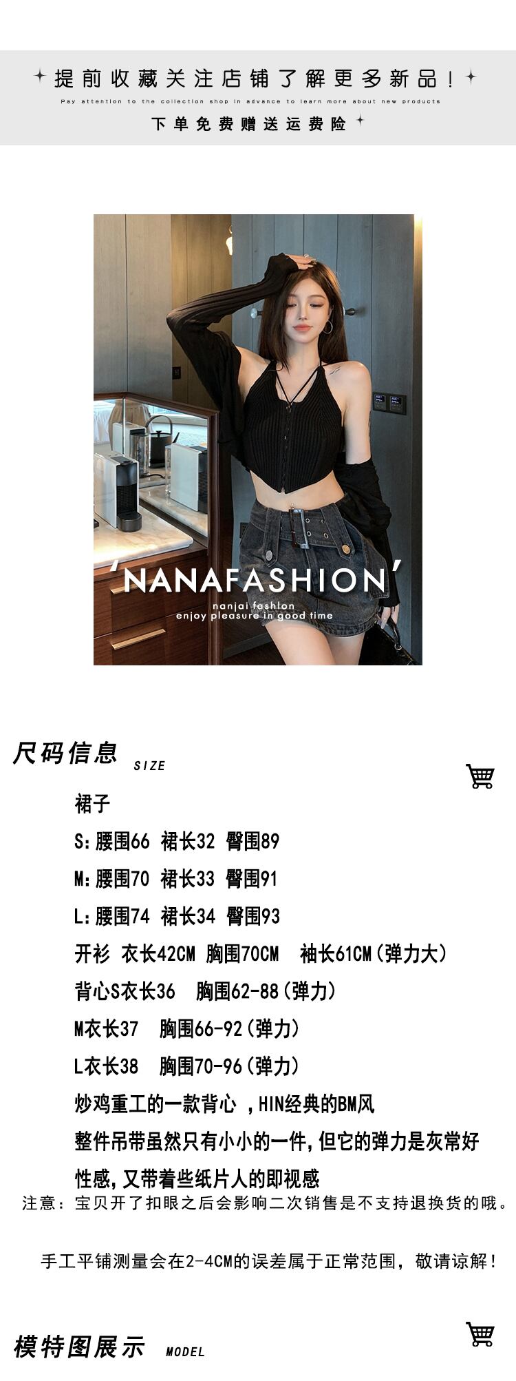 three-piece suit female 2022 summer new suspenders tooling denim skirt long-sleeved knitted jacket ロング サマー 夏物 スカート nana65680183124 | modepoisson