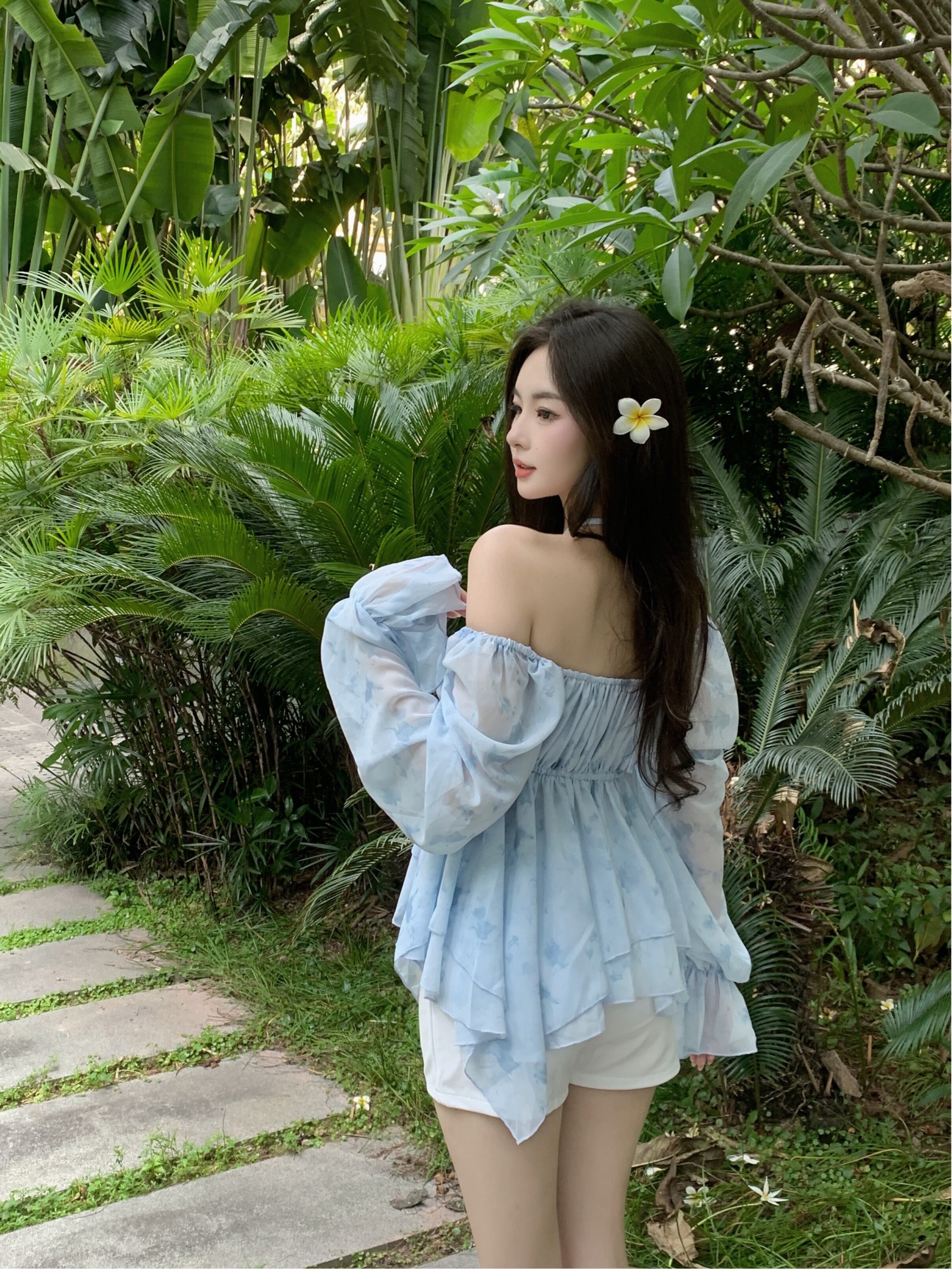 2022 summer new halter neck tie-dye sunscreen chiffon shirt loose ruffled niche age-reducing blue top women's clothing ブルー シフォン サマー 夏物 nana43670630917 | modepoisson