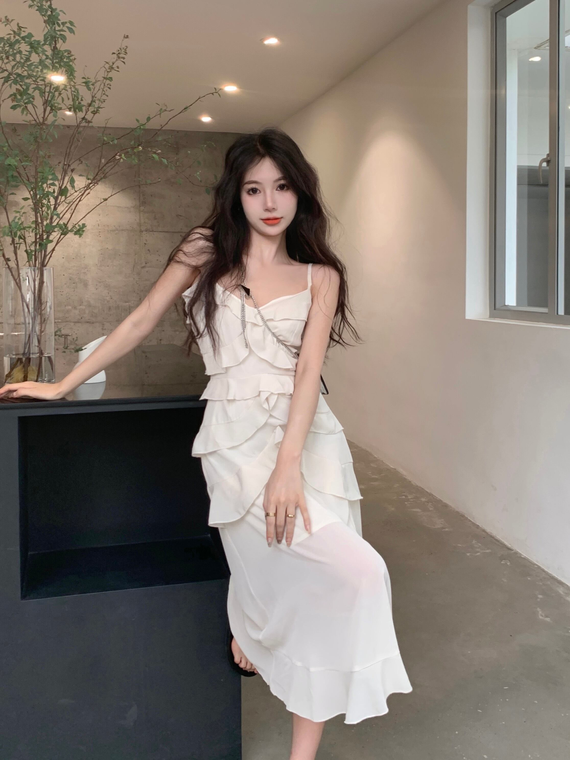 Chiffon suspender skirt 2022 summer new ruffled French temperament fairy mid-length slit dress シフォン サマー 夏物 スカート nana18897185336 | modepoisson