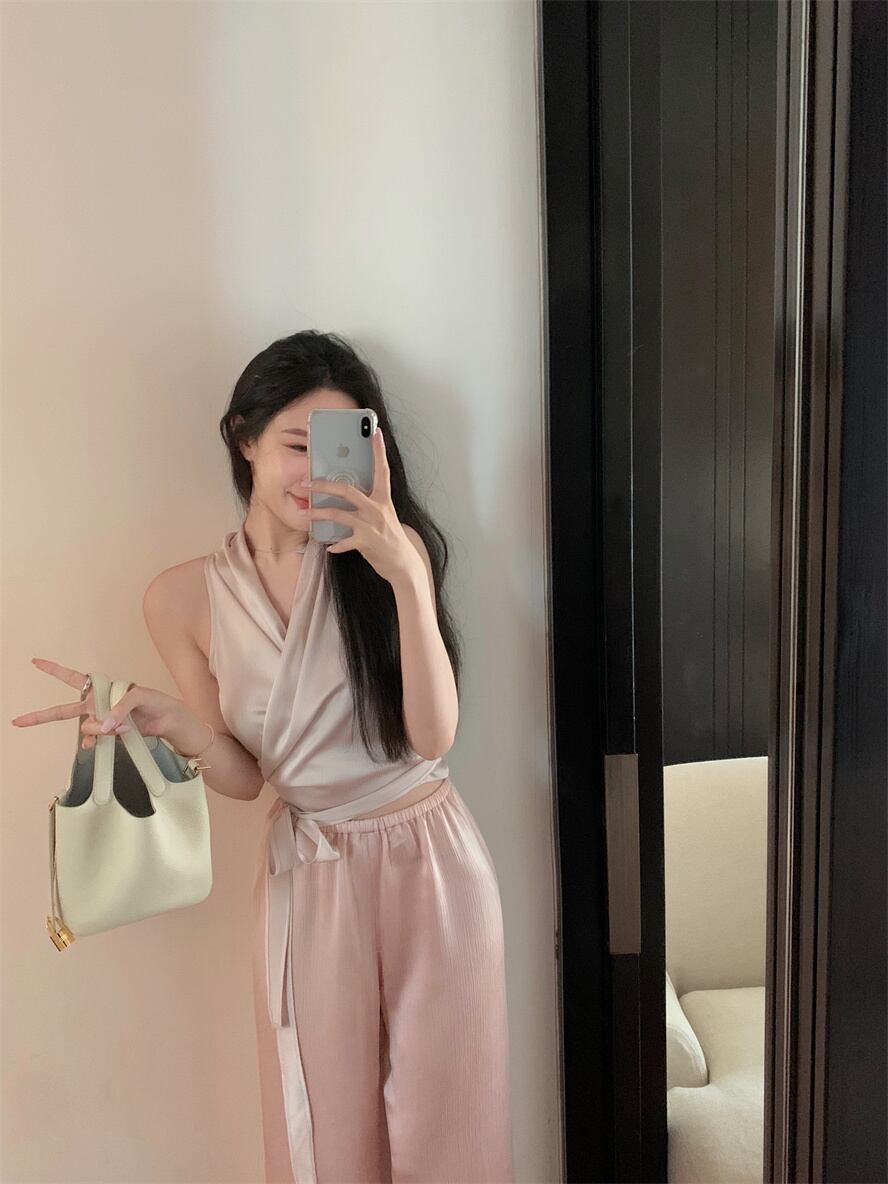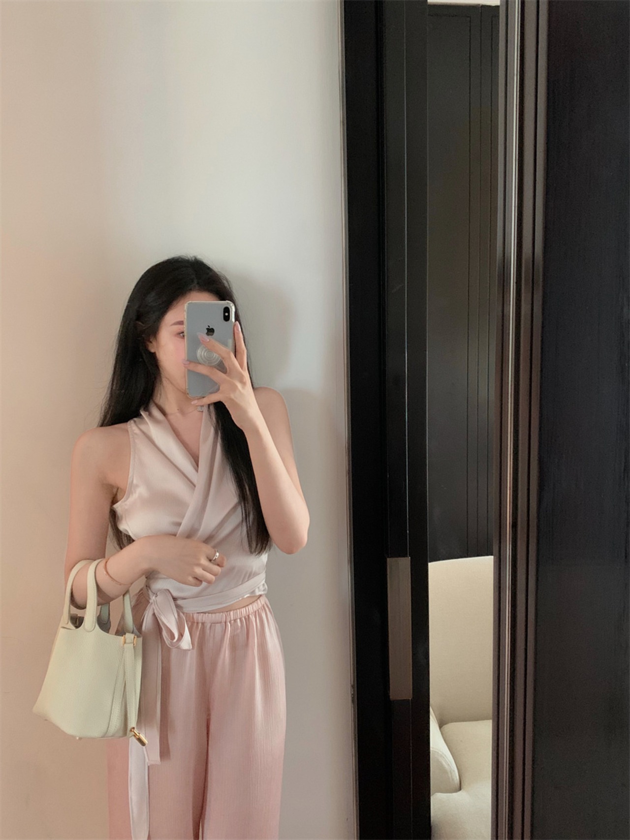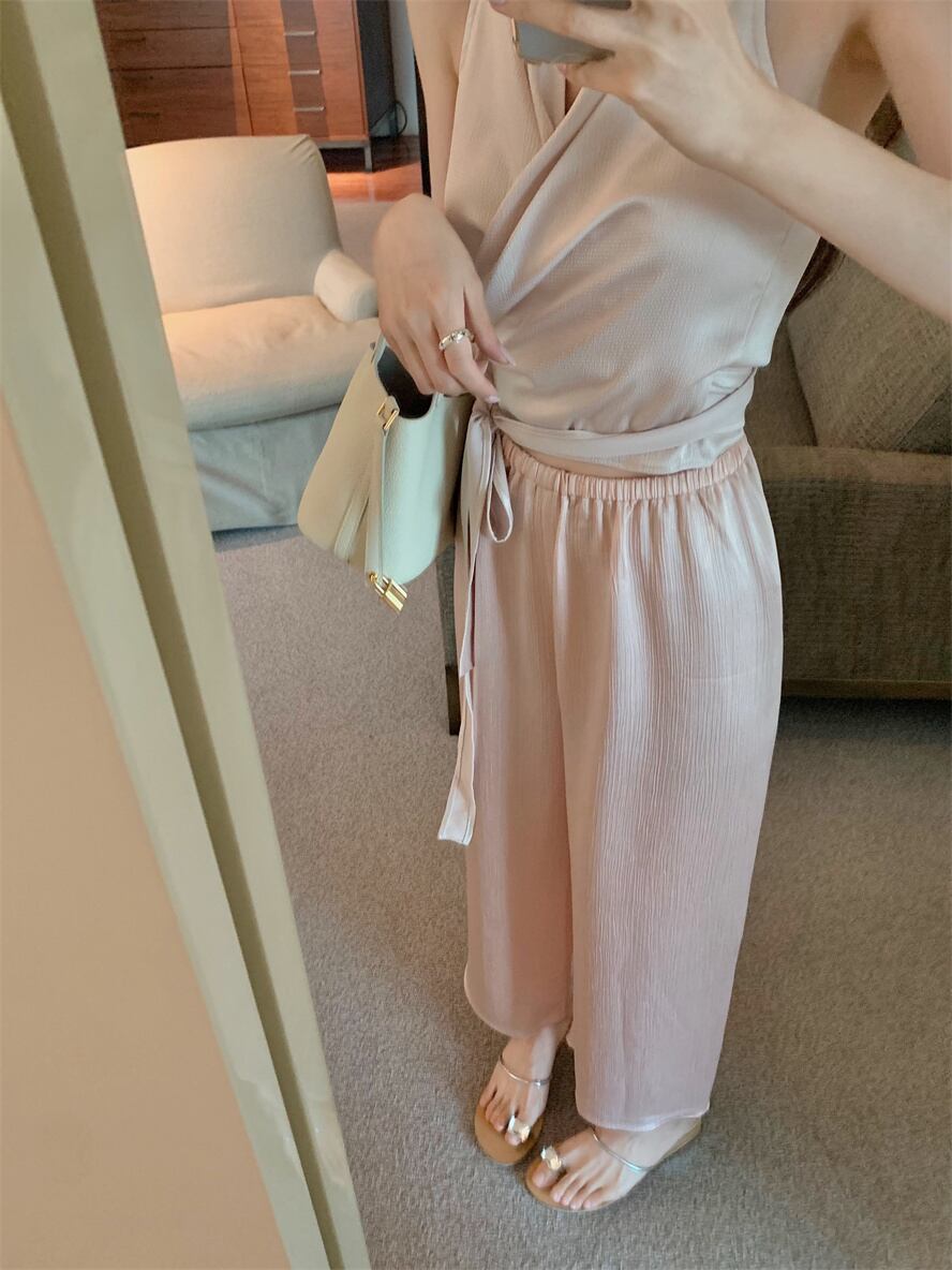 Summer suit women's 2022 new bandage v-neck waist halter sleeveless top temperament straight-leg casual nine-point pants カジュアル サマー 夏物 ノースリーブ Vネック nana78982215322
