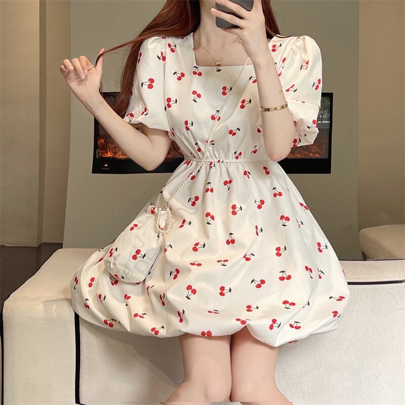 Small French gentle wind skirt 2022 summer new square neck floral puff sleeve waist dress women's サマー 夏物 花柄 スカート スクウェア nana93123104344 | modepoisson