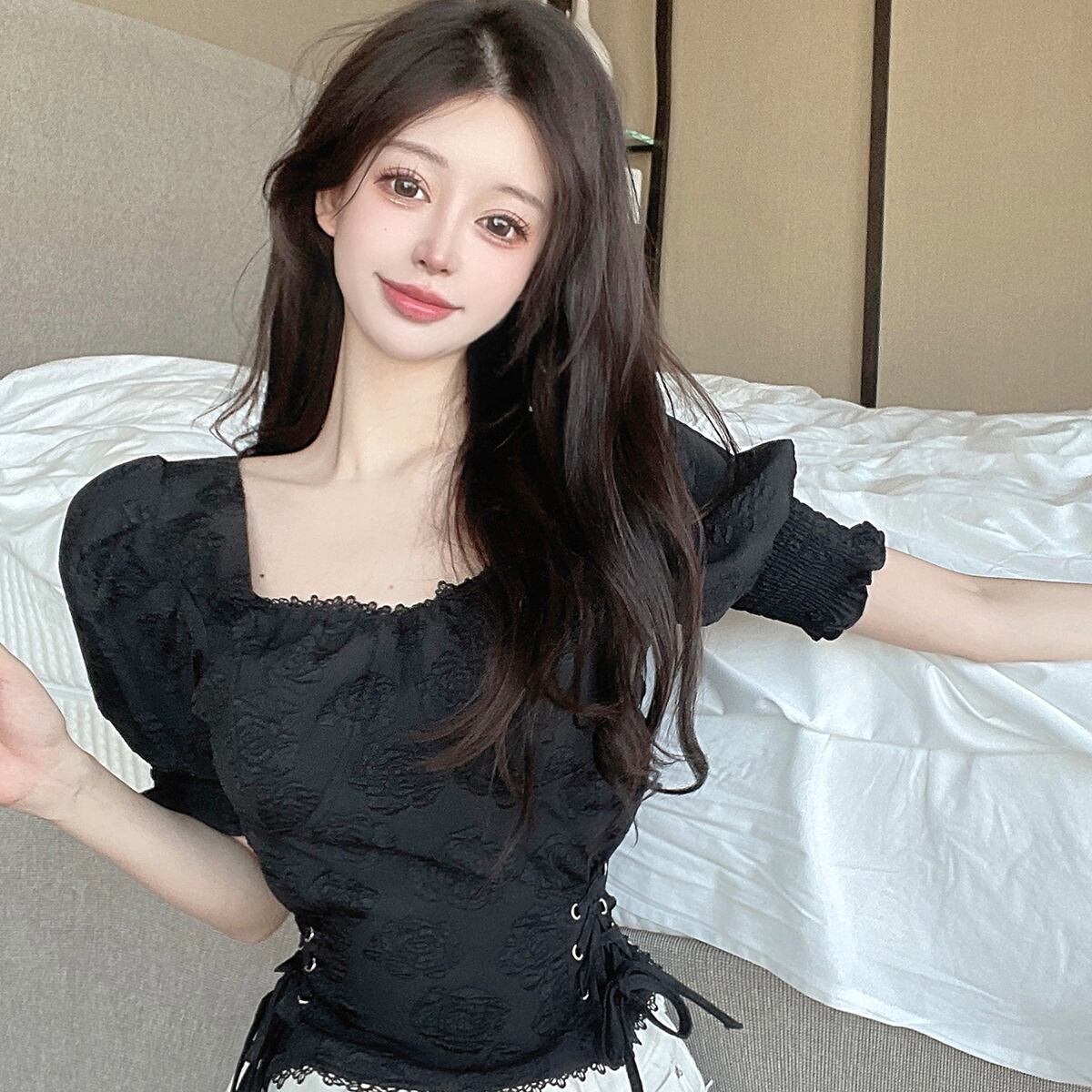 Square neck waist design small puff sleeve shirt ladies 2022 summer new chic and unique short-sleeved top サマー 夏物 スクウェア nana23280071468 | modepoisson