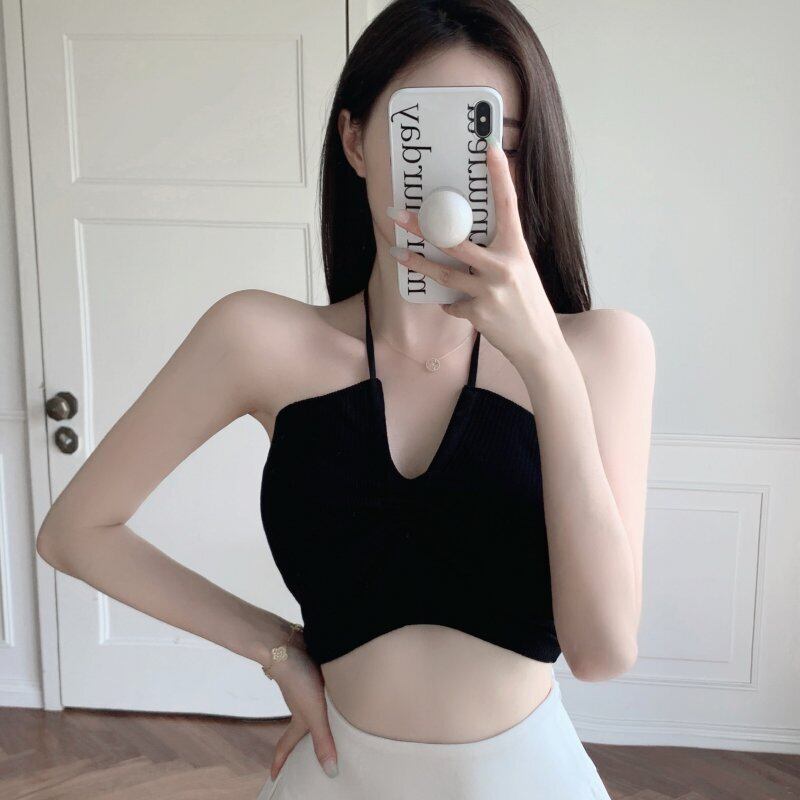 Pure desire wind halter neck strap knitted suspender vest summer sleeveless sexy seaside bottoming short top women's clothing ショート サマー 夏物 ノースリーブ nana95716000906 | modepoisson