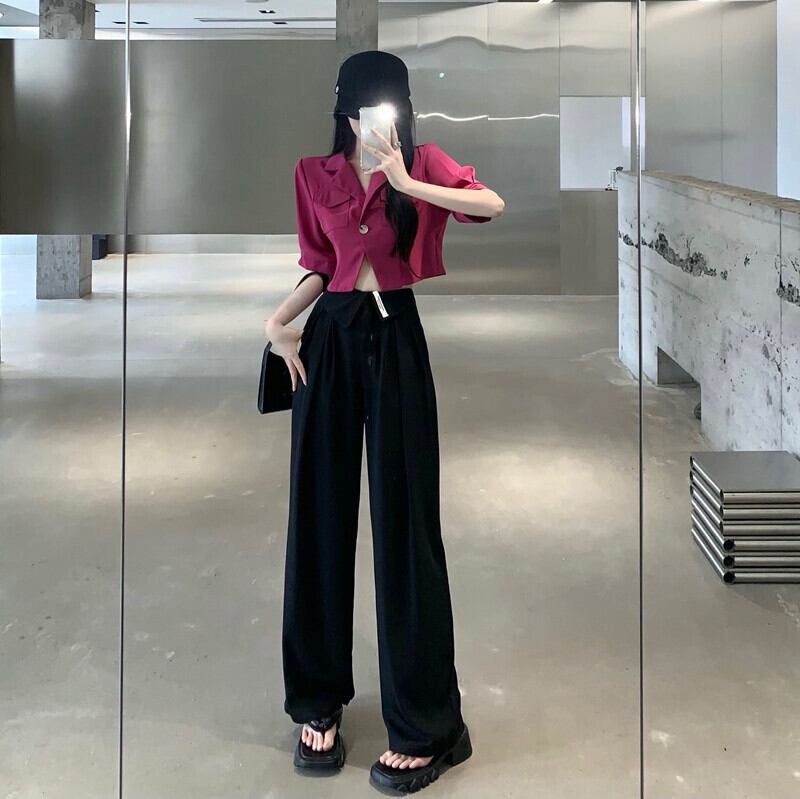 Suit female 2022 summer new fashion short suit shirt top high waist casual wide leg trousers two-piece set ハイウェスト ショート カジュアル サマー 夏物 ワイドレッグ ワイドパンツ nana79784350646 | modepoisson
