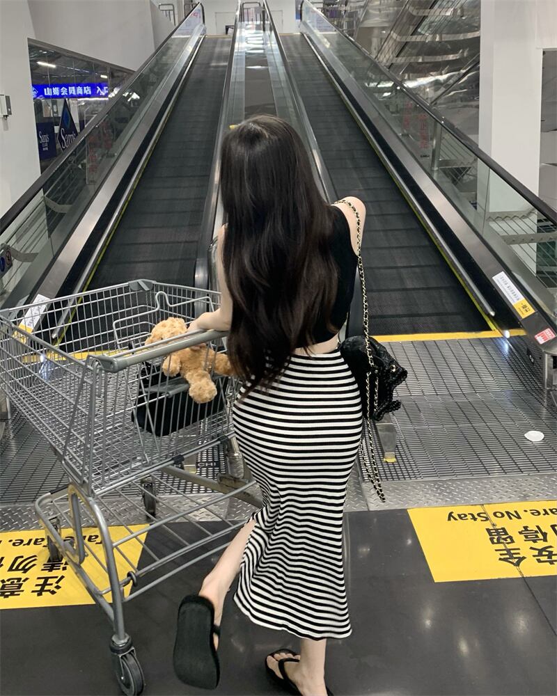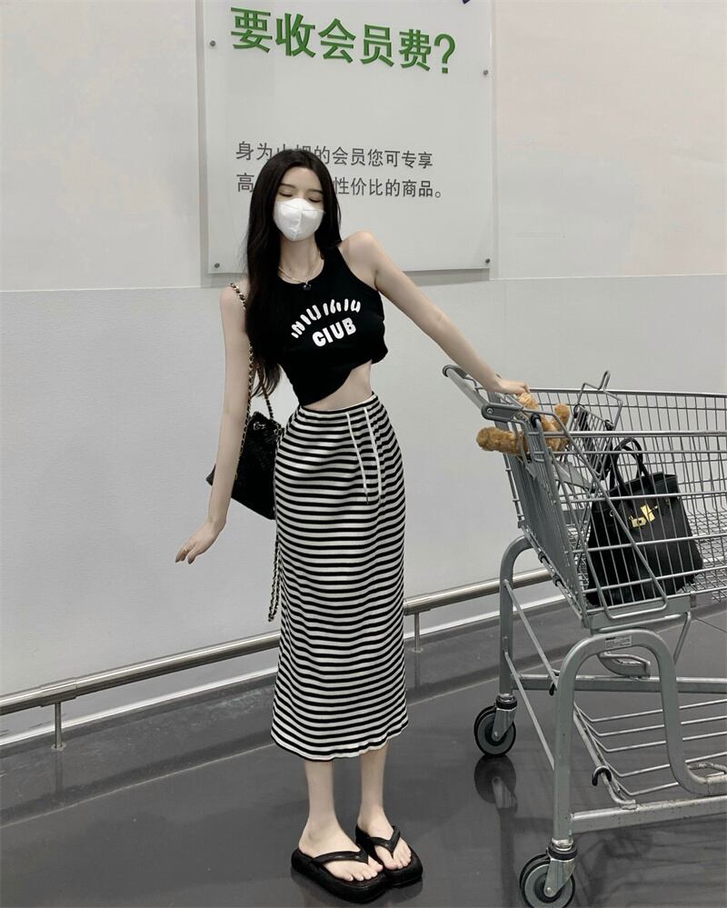 casual two-piece suit women's 2022 summer new vest printing top black and white striped skirt ホワイト ブラック カジュアル サマー 夏物 スカート ストライプ nana52530688214 | modepoisson