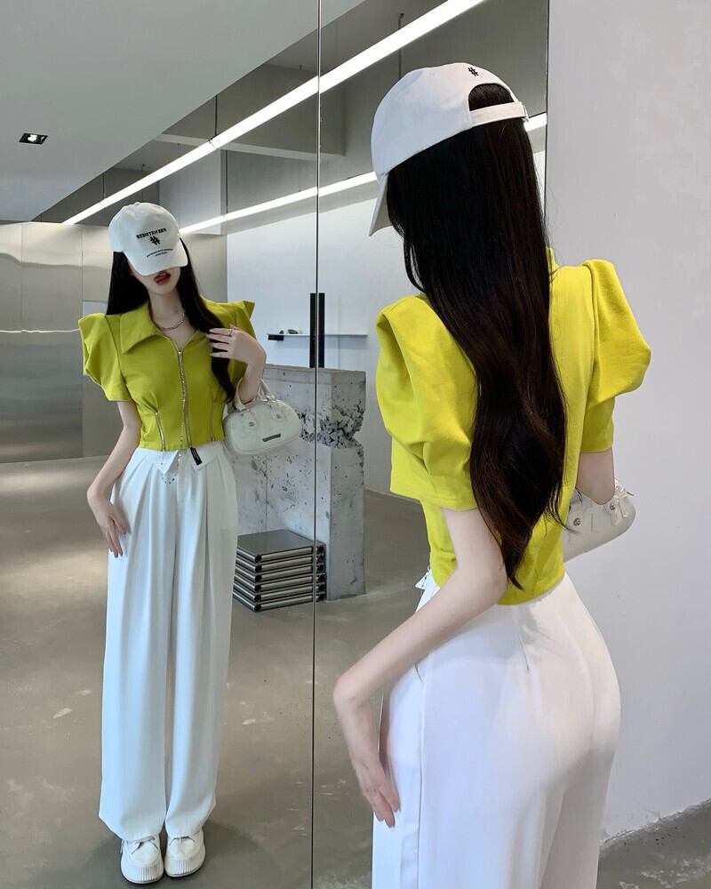 Sweet light luxury two-piece pants 2022 summer new fashion puff sleeve top high waist wide leg pants women's suit ハイウェスト 大人ガーリー スウィート キュート カジュアル サマー 夏物 ワイドレッグ ワイドパンツ nana82308757790 | modepoisson