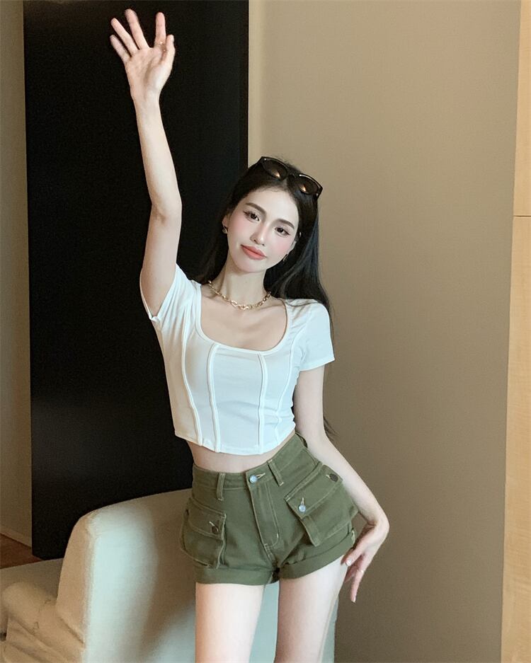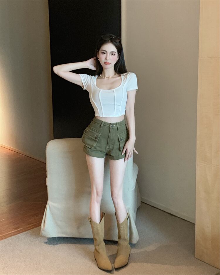 Western-style age-reducing and slimming suit 2022 summer new tight short-sleeved top high waist tooling denim shorts women's clothing ハイウェスト サマー 夏物 ショーツ ブルマー nana78427752781 | modepoisson