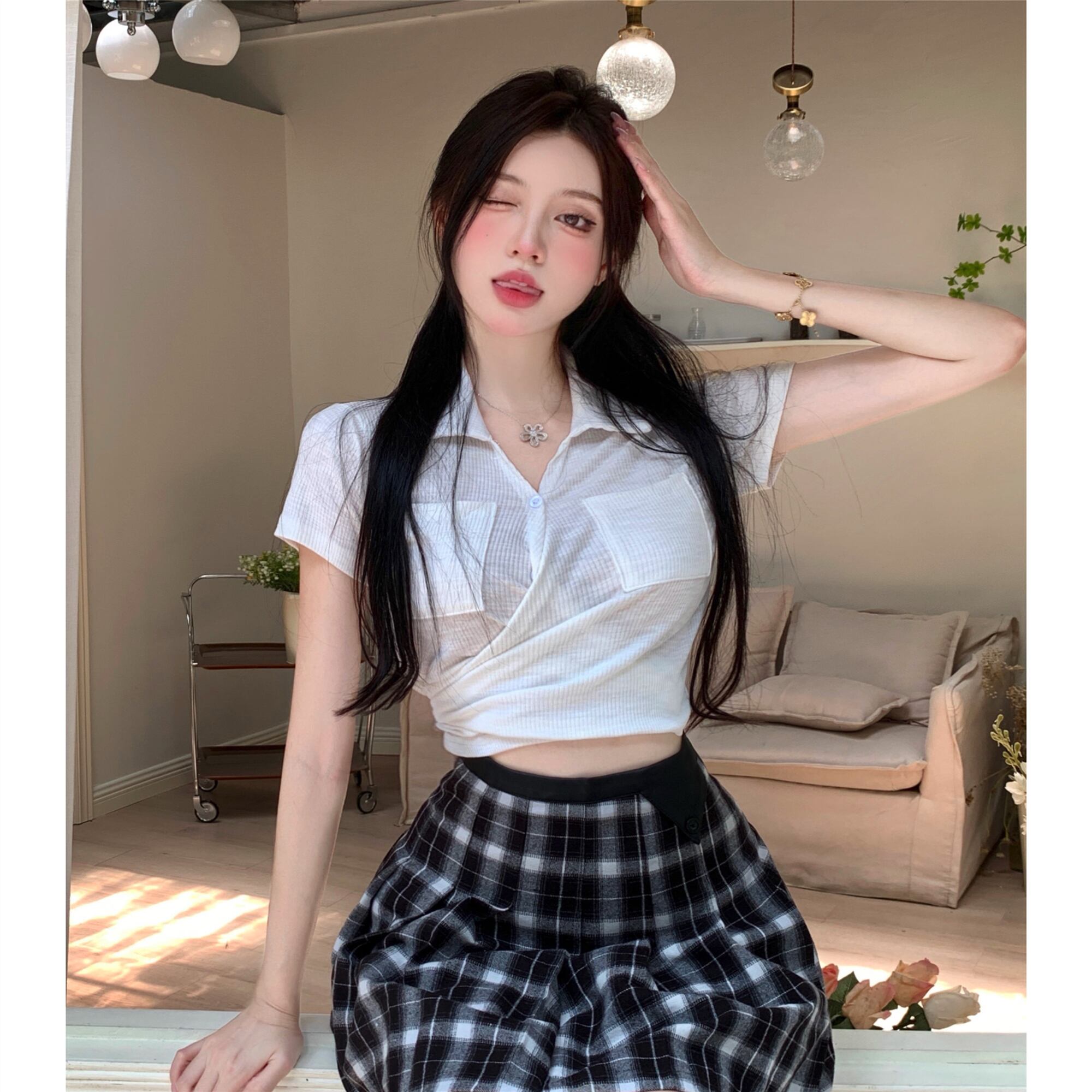 Lace up polo collar t-shirt women's summer 2022 new short slim fit design niche chic top ショート レース サマー 夏物 スリム Tシャツ レースアップ nana37184818459 | modepoisson