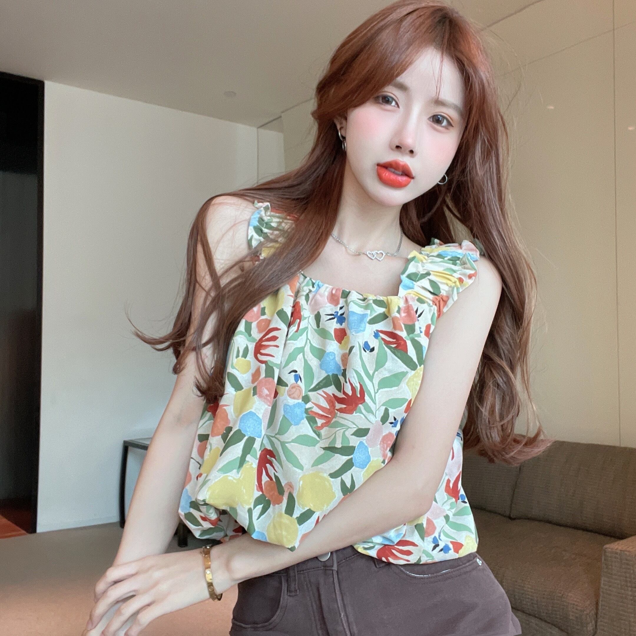 Floral Sleeveless Camisole Women's Summer Sense Small French Outer Wear Hot Girl Short Slim Fit Thin Top ショート サマー 夏物 ノースリーブ 花柄 スリム nana3741196812 | modepoisson