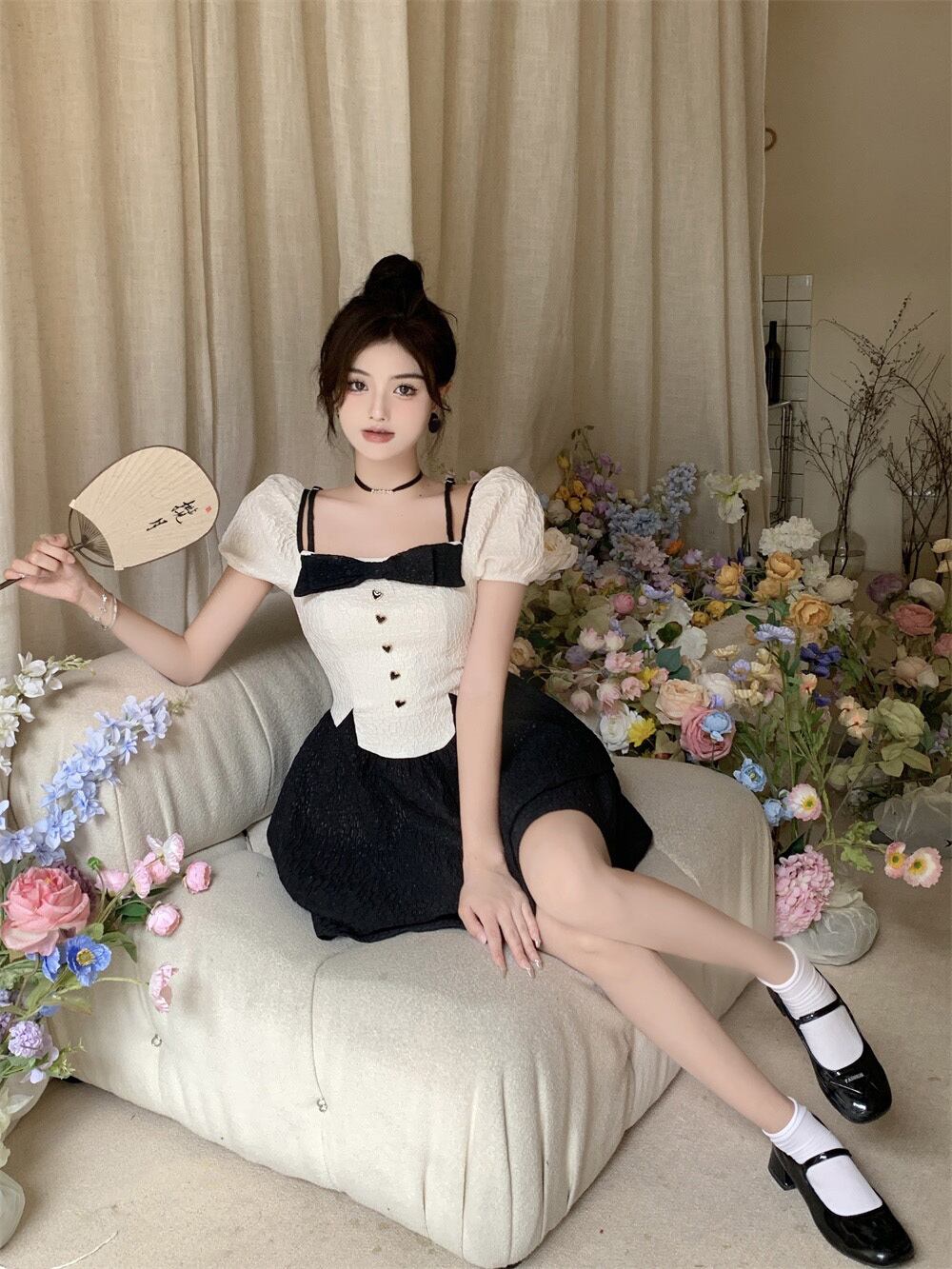 French square neck puff sleeve waist dress women's 2022 summer new chic temperament tea break milk sweet skirt 大人ガーリー スウィート キュート カジュアル サマー 夏物 スカート スクウェア nana72899472359 | modepoisson