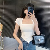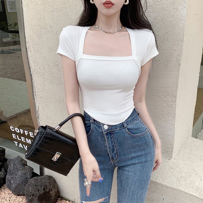 2022 summer new slim fit short sexy square neck short sleeve t-shirt women's pure desire style white top ショート ホワイト 半袖 ハーフスリーブ サマー 夏物 スリム Tシャツ ピュア スクウェア nana65987877753 | modepoisson