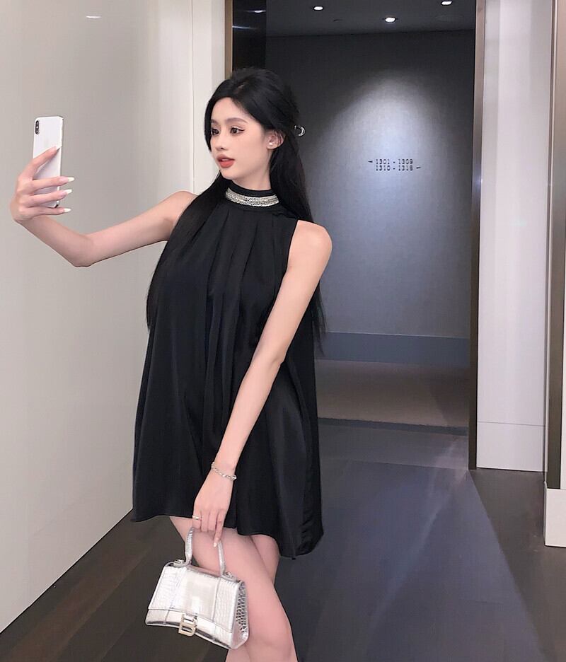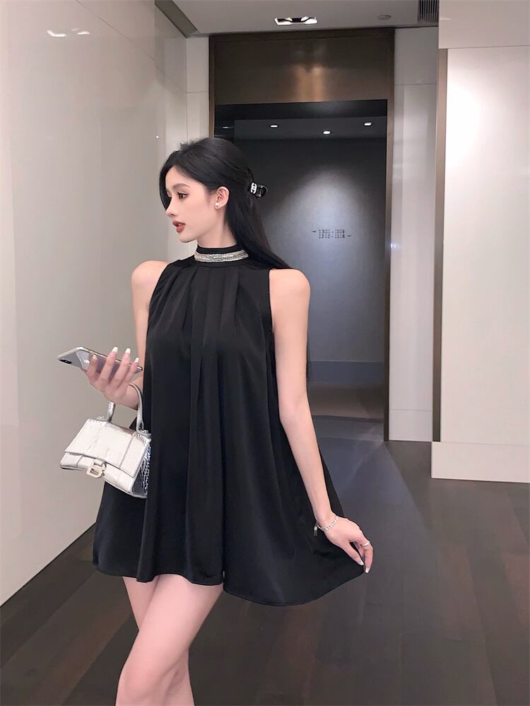 Black slim A-line satin halter neck off-shoulder dress women's 2022 summer new temperament sleeveless short skirt ショート ブラック サマー 夏物 ノースリーブ スカート Aライン サテン スリム オフショルダー nana69046275985 | modepoisson