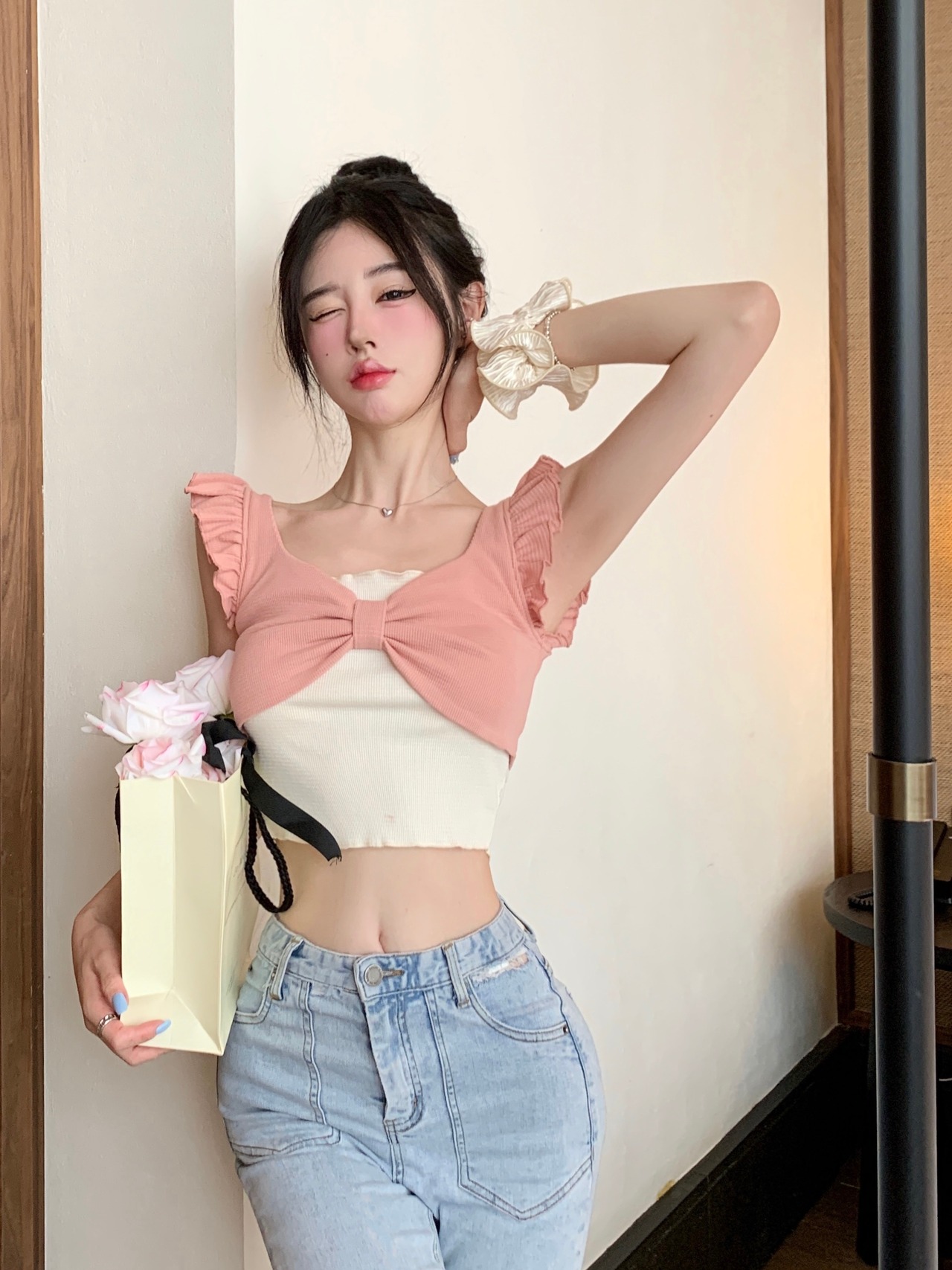 sense niche bow small flying sleeve top women's summer outer wear pure desire style short camisole ショート リボン サマー 夏物 ピュア nana24325521310 | modepoisson