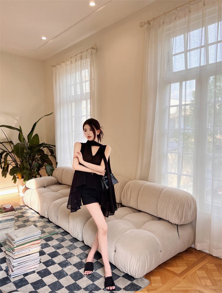 Chiffon Shirt Women's 2022 Summer Pure Desires Off-the-shoulder V-neck Black Sense of Small Irregular Tops ブラック シフォン サマー 夏物 Vネック ピュア nana55550457680 | modepoisson