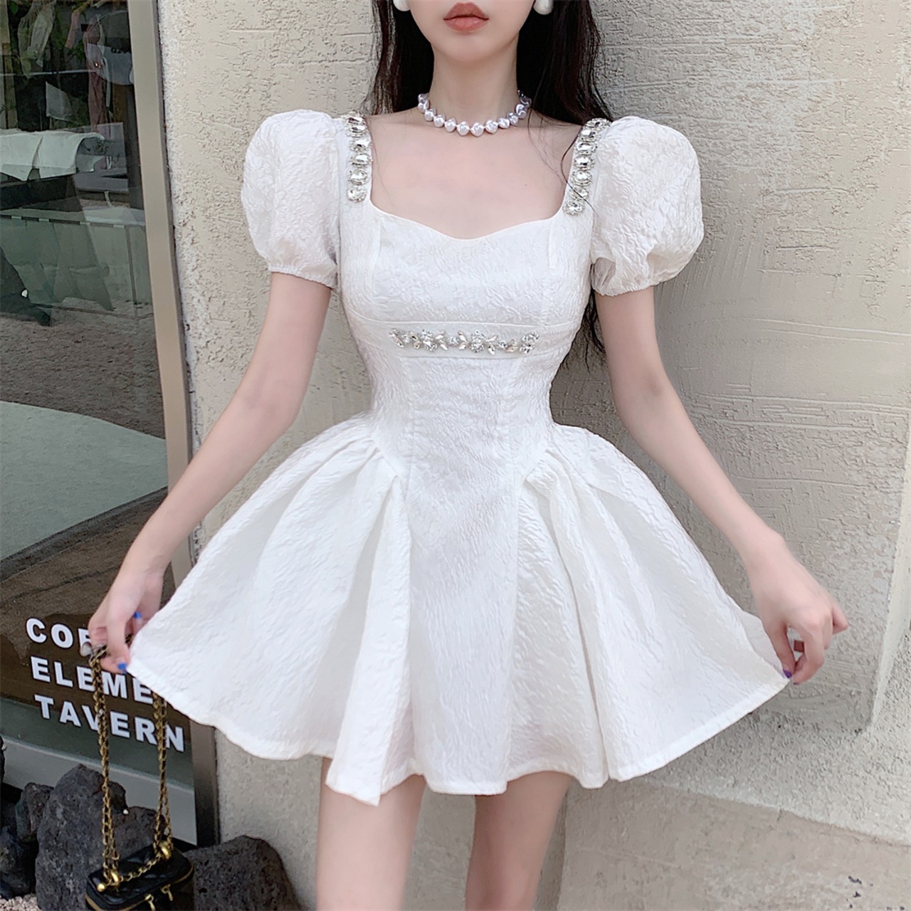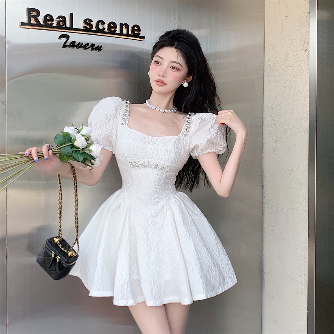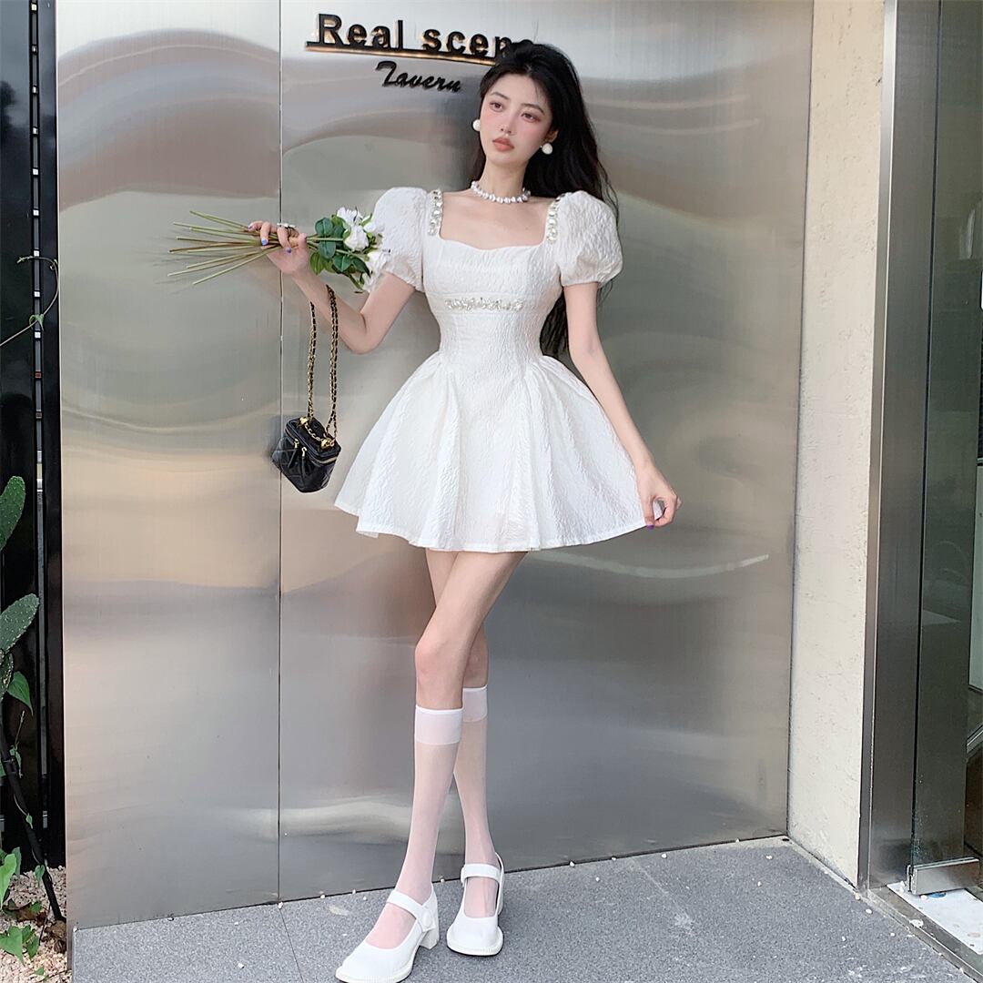 Chic and beautiful dress waist 2022 summer new French temperament square neck puff sleeves slim skirt women's clothing サマー 夏物 スカート スリム スクウェア nana59830647229 | modepoisson