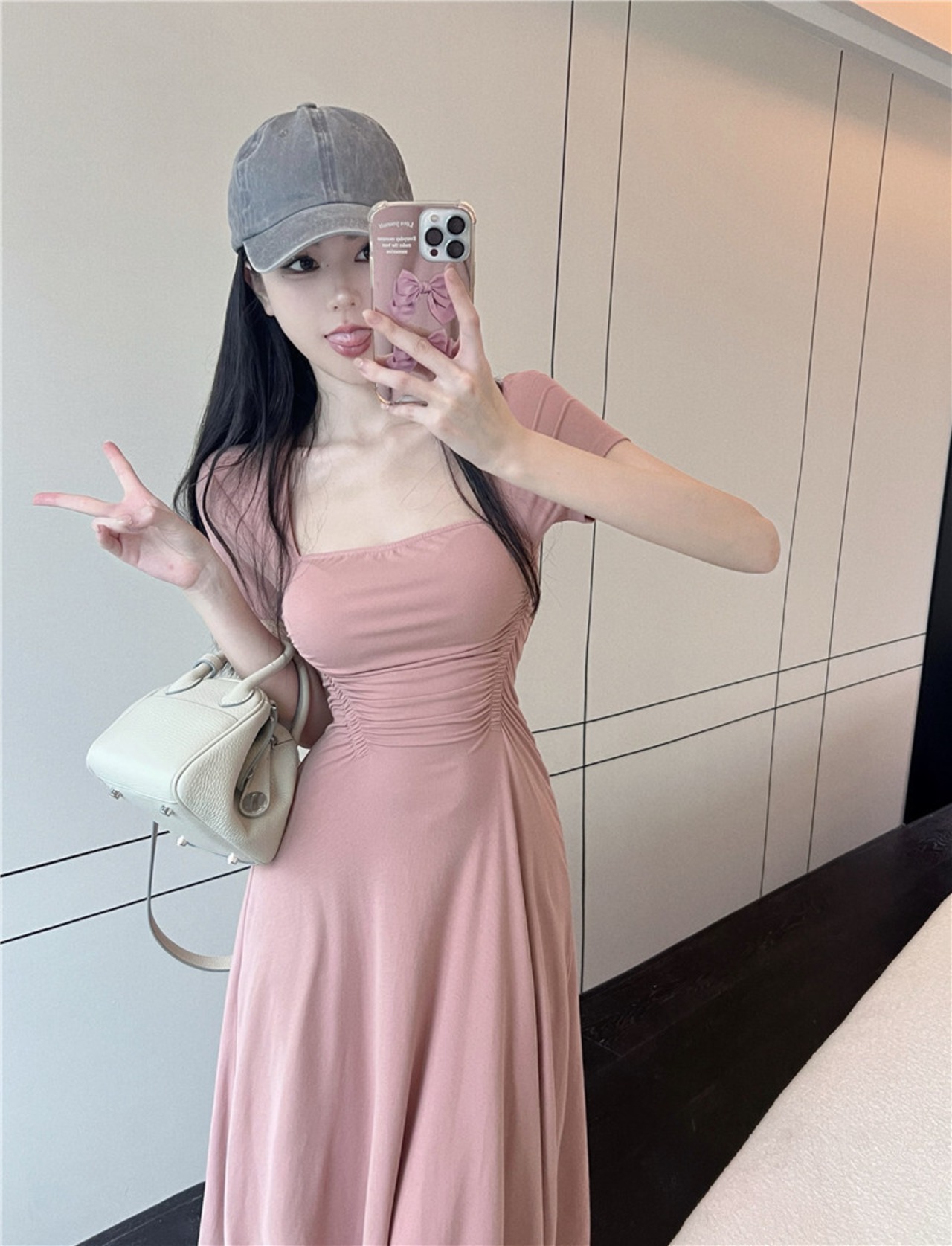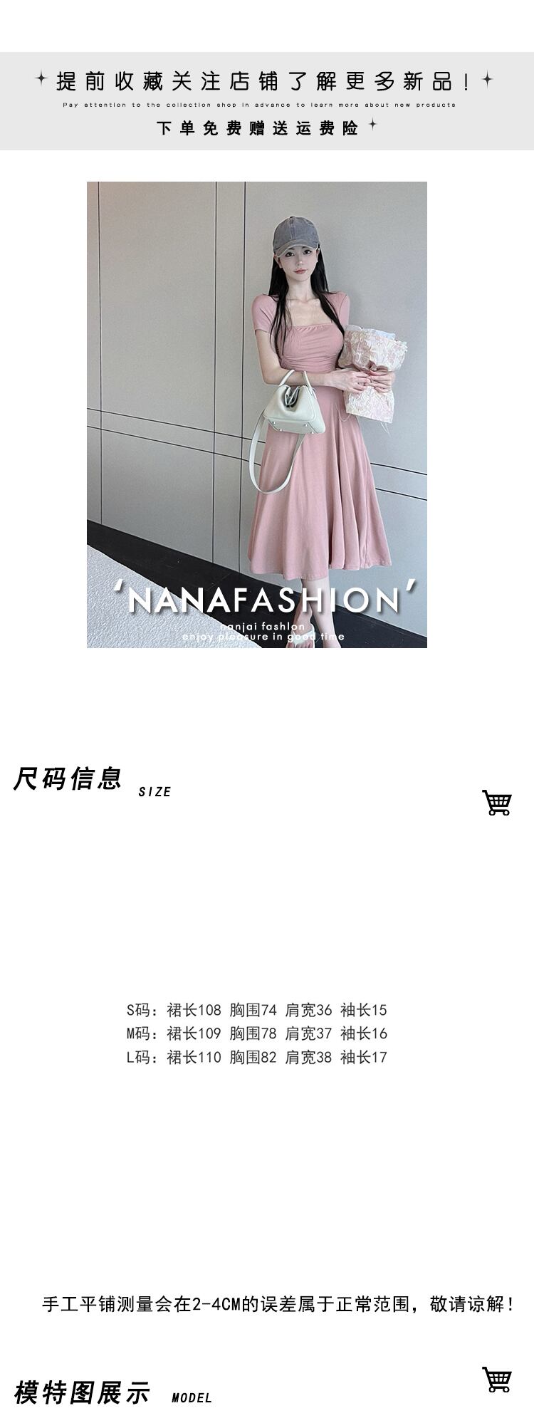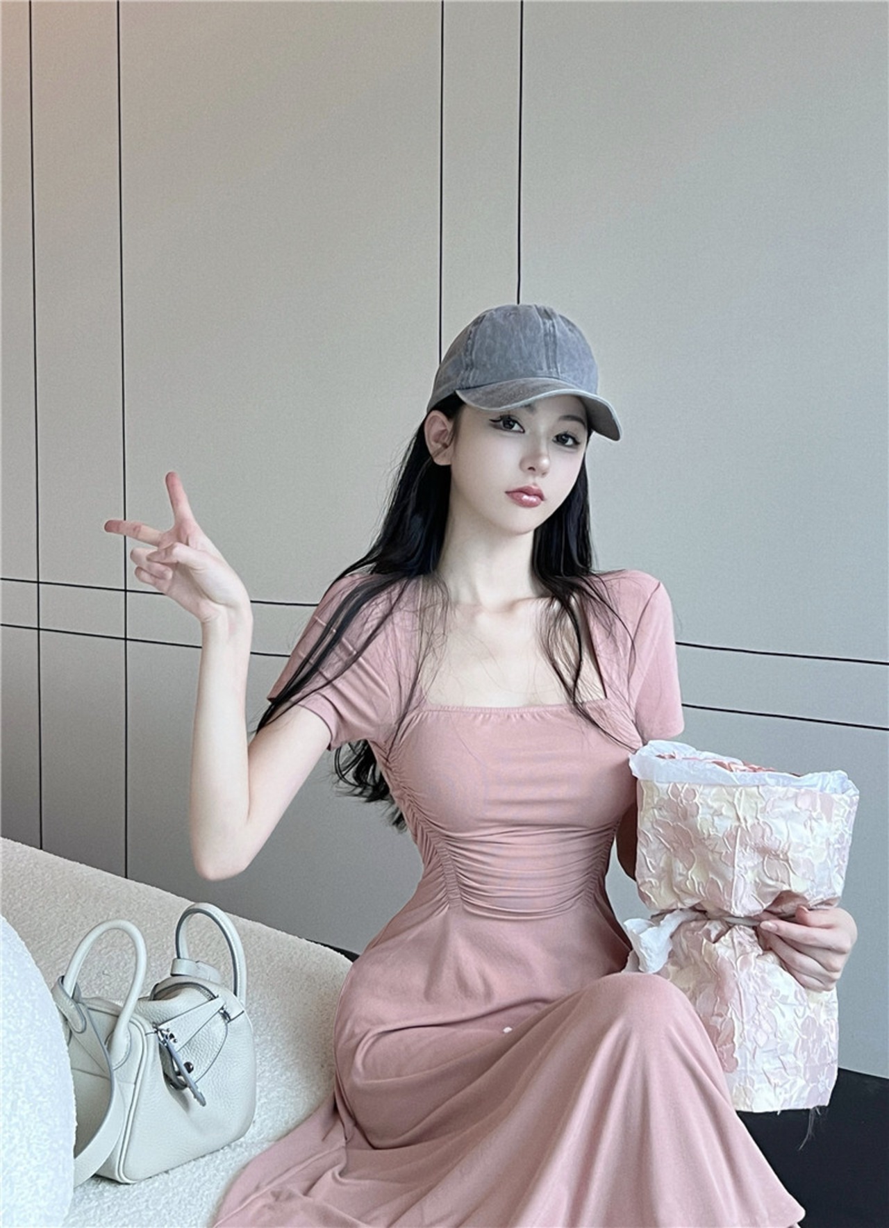 Pink square-neck short-sleeved waist-length dress women's 2022 summer new French style slim and explosive long skirt ロング ピンク サマー 夏物 スカート スリム スクウェア nana46015593687 | modepoisson