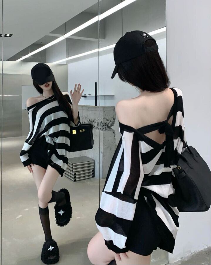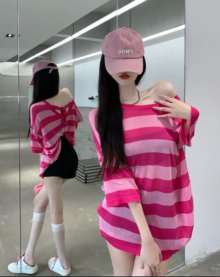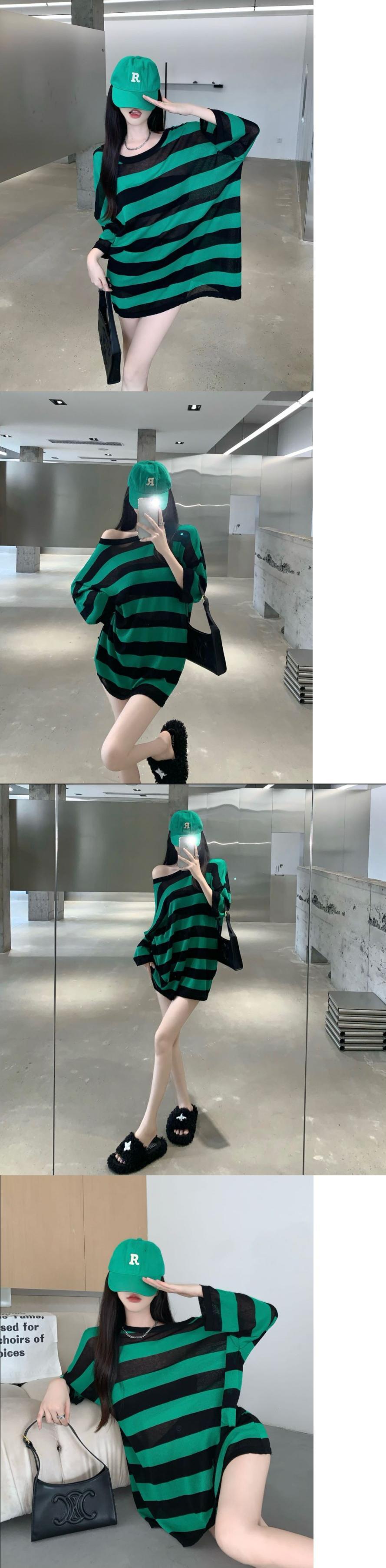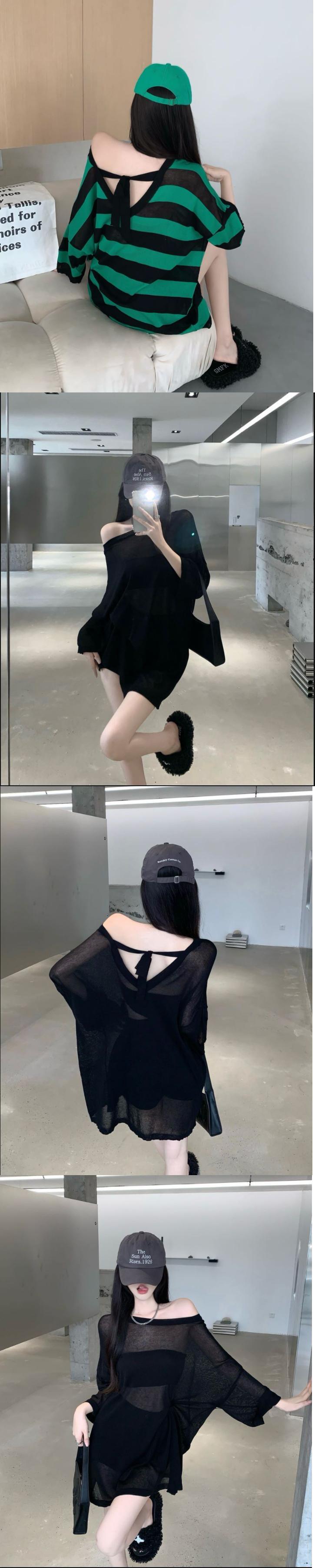 Sexy back careful machine strap knitted sweater 2022 summer new chic striped loose t-shirt top women サマー 夏物 ストライプ Tシャツ nana7586518330 | modepoisson