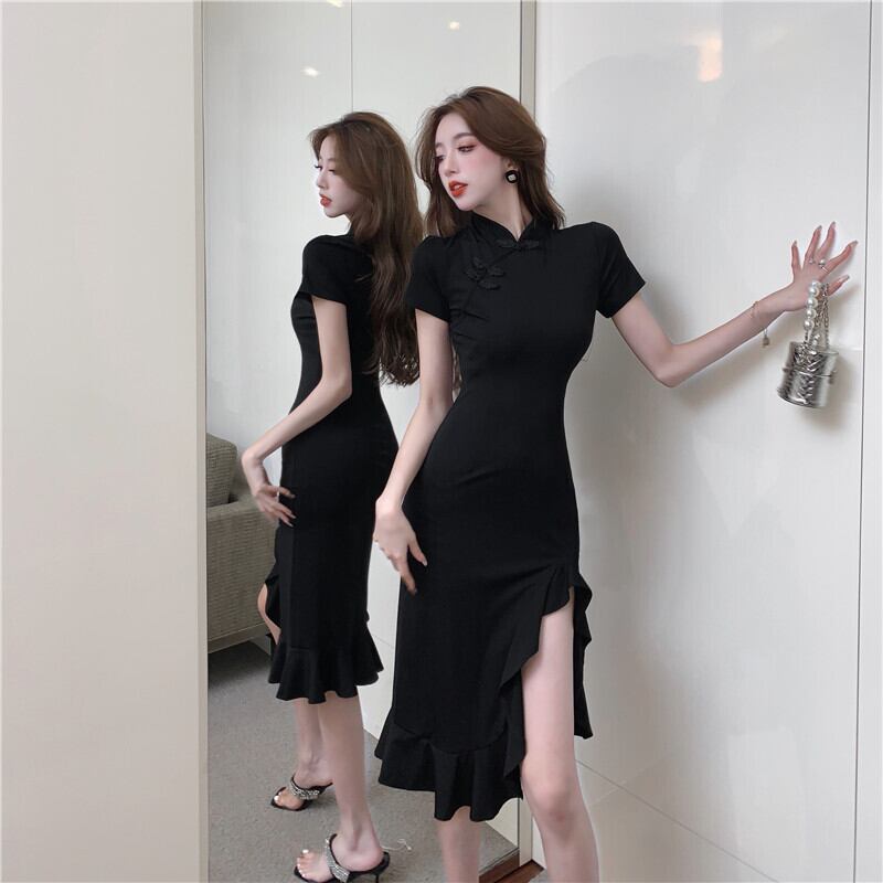 Black long skirt 2022 summer new French temperament sexy slit short-sleeved long cheongsam dress women ロング ブラック サマー 夏物 スカート nana53304434297 | modepoisson
