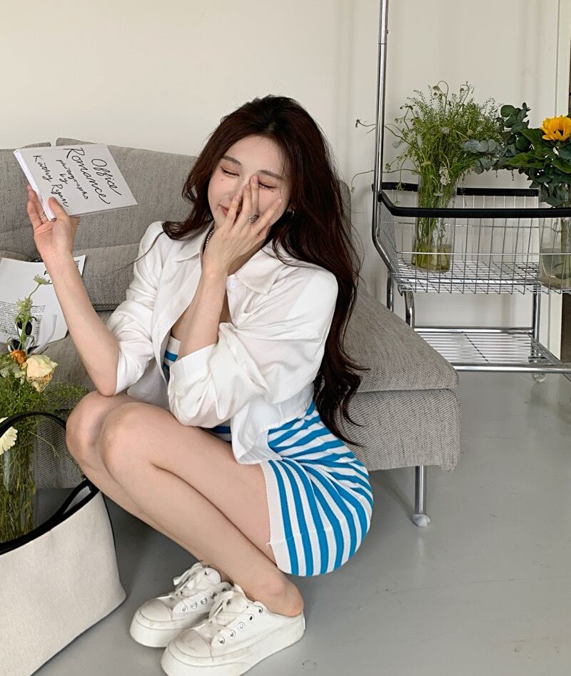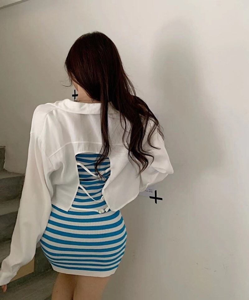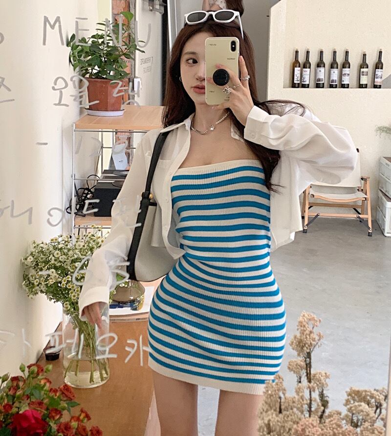 two-piece suit female 2022 summer new casual tube top striped knitted dress sunscreen shirt カジュアル サマー 夏物 ストライプ nana63106756995 | modepoisson