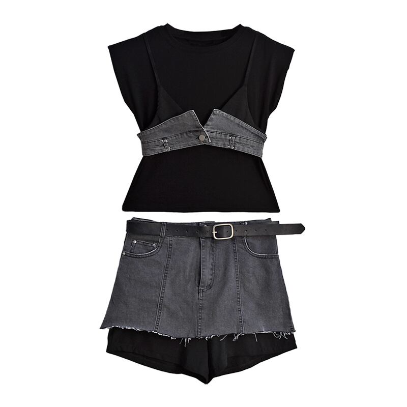 2022 summer new fashion t-shirt denim short skirt pants sweet and spicy women's western style summer two-piece suit trend ショート 大人ガーリー スウィート キュート カジュアル サマー 夏物 スカート Tシャツ nana35246617240 | modepoisson