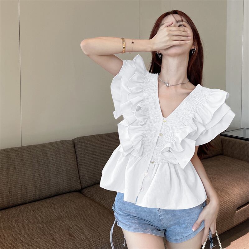 French ruffled fungus edge top 2022 summer new design niche Feifei sleeve waist shirt ladies サマー 夏物 nana39729167421 | modepoisson