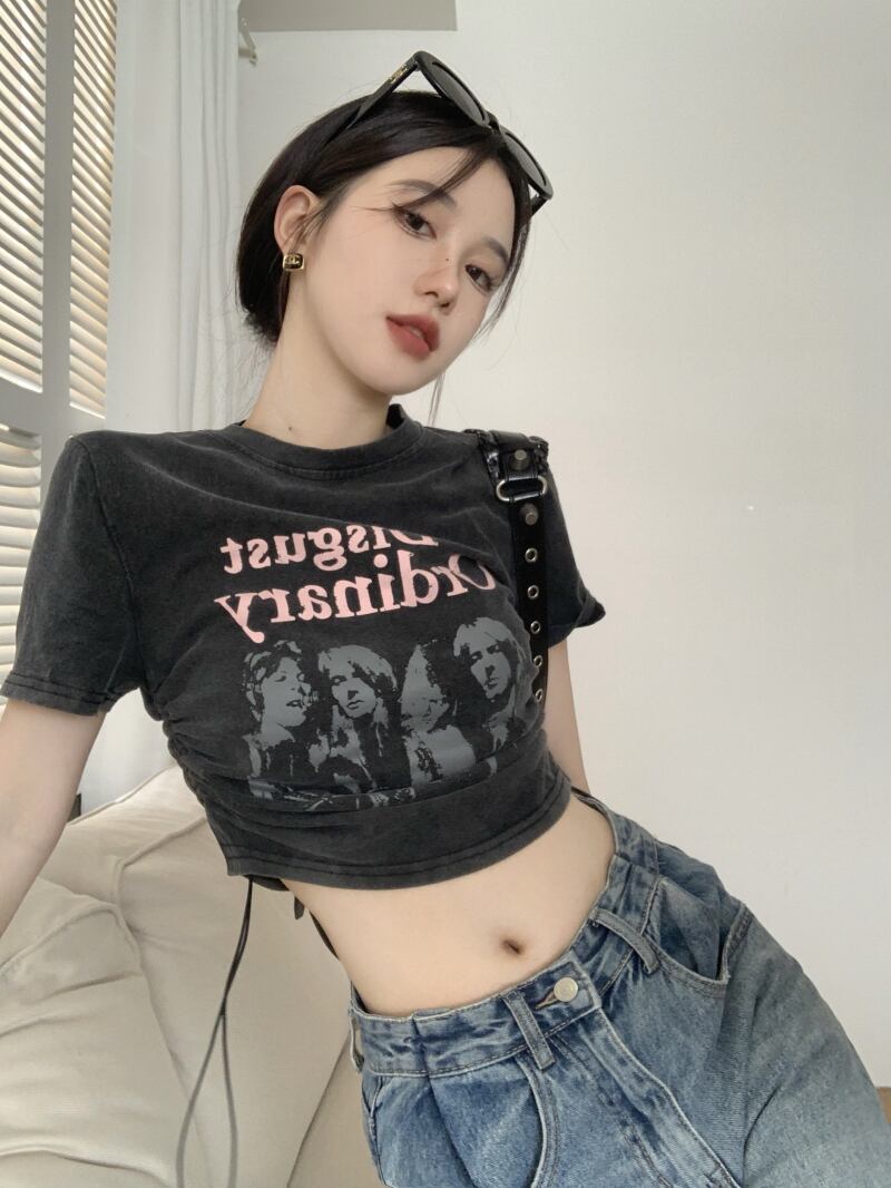 American short-sleeved retro t-shirt women's 2022 summer new design small drawstring short top ショート レトロ サマー 夏物 Tシャツ nana81789852417 | modepoisson