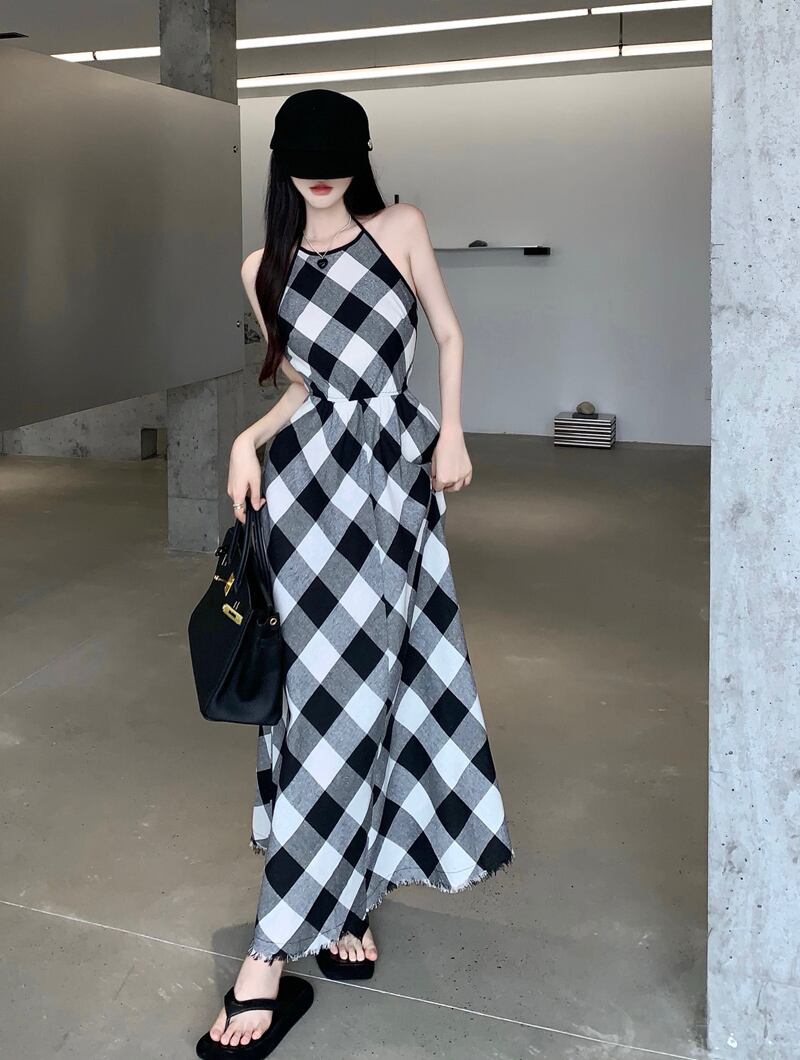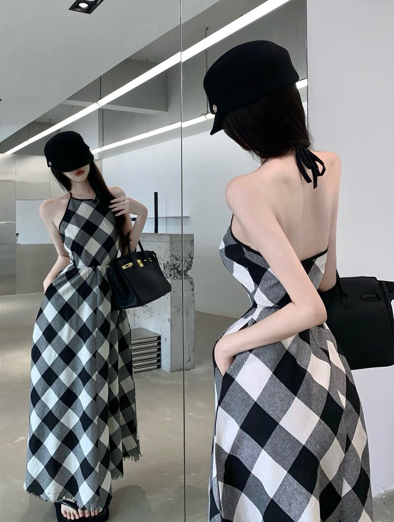 -quality sleeveless halterneck suspender dress women's 2022 summer new plaid temperament waist and thin long skirt ロング サマー 夏物 ノースリーブ スカート nana48118270420 | modepoisson
