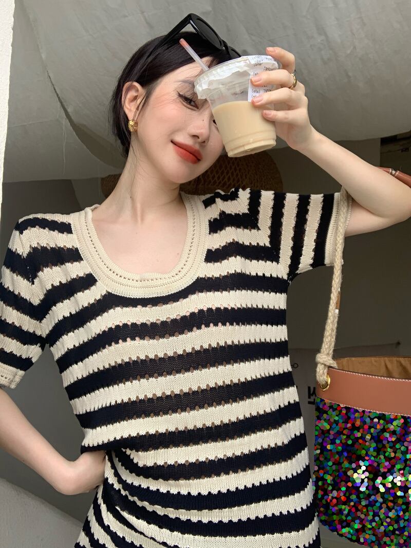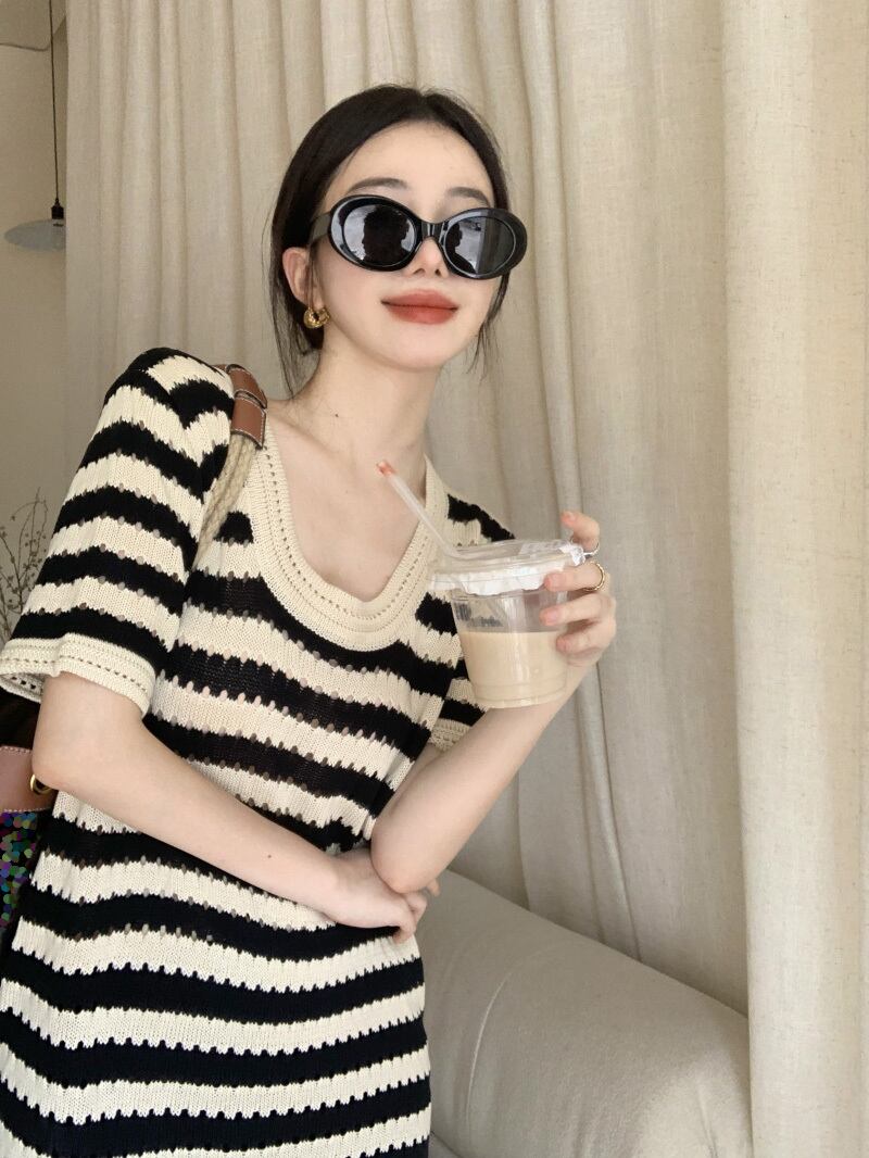 French temperament striped knitted short-sleeved dress women's 2022 summer new loose and thin skirt サマー 夏物 スカート ストライプ nana14906906945 | modepoisson