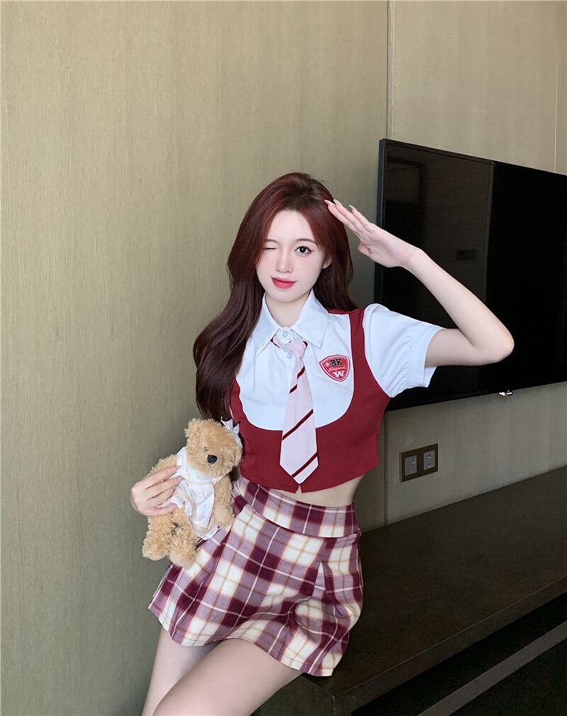 色:チェックスカート,Faketwo-pieceshirt/tie