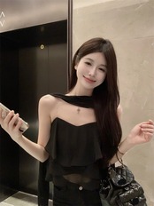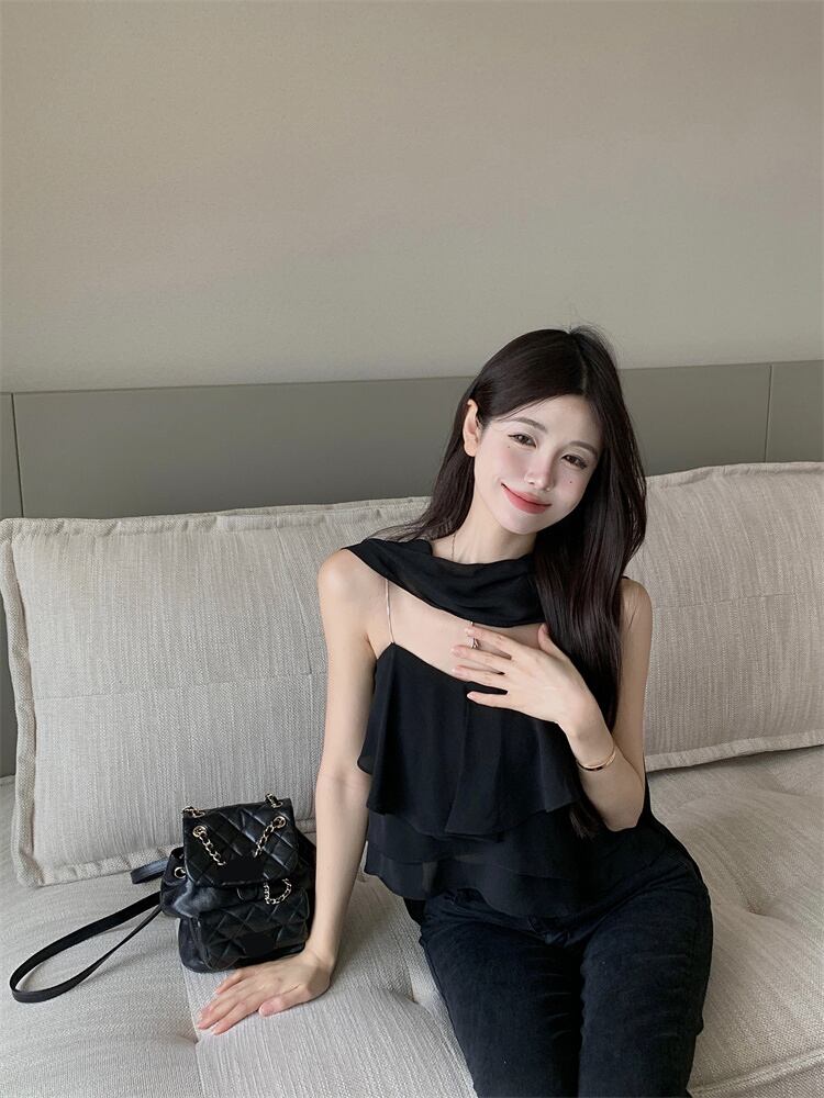 Black chiffon camisole summer outerwear French off-the-shoulder sexy pure desire wind short top women ショート ブラック シフォン サマー 夏物 ピュア nana84989639978 | modepoisson