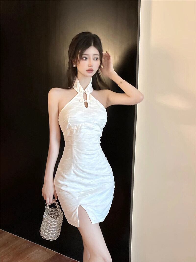 2022 summer new French temperament retro improved halter neck off shoulder waist slit cheongsam dress women's レトロ サマー 夏物 オフショルダー nana90435452794 | modepoisson