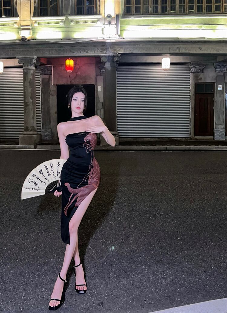 Sexy hanging neck Chinese style dress 2022 summer new French ladies temperament waist skirt women's clothing サマー 夏物 スカート nana93503791521 | modepoisson