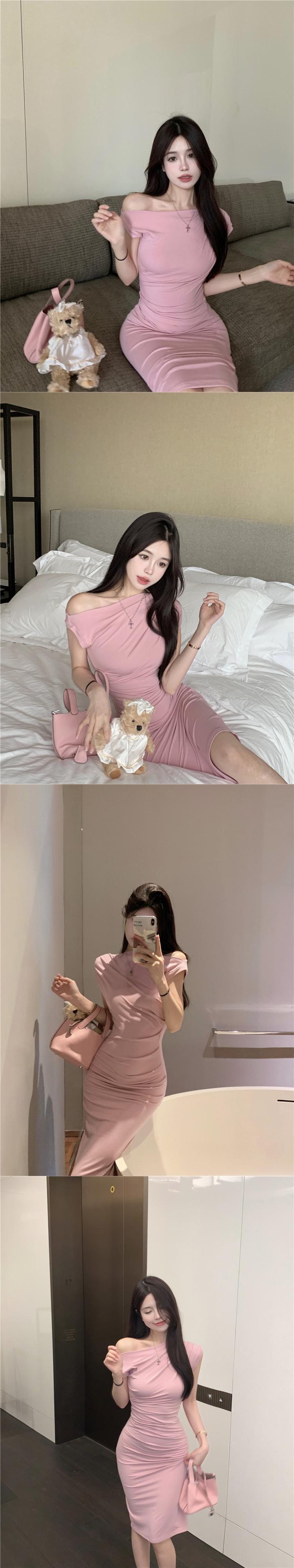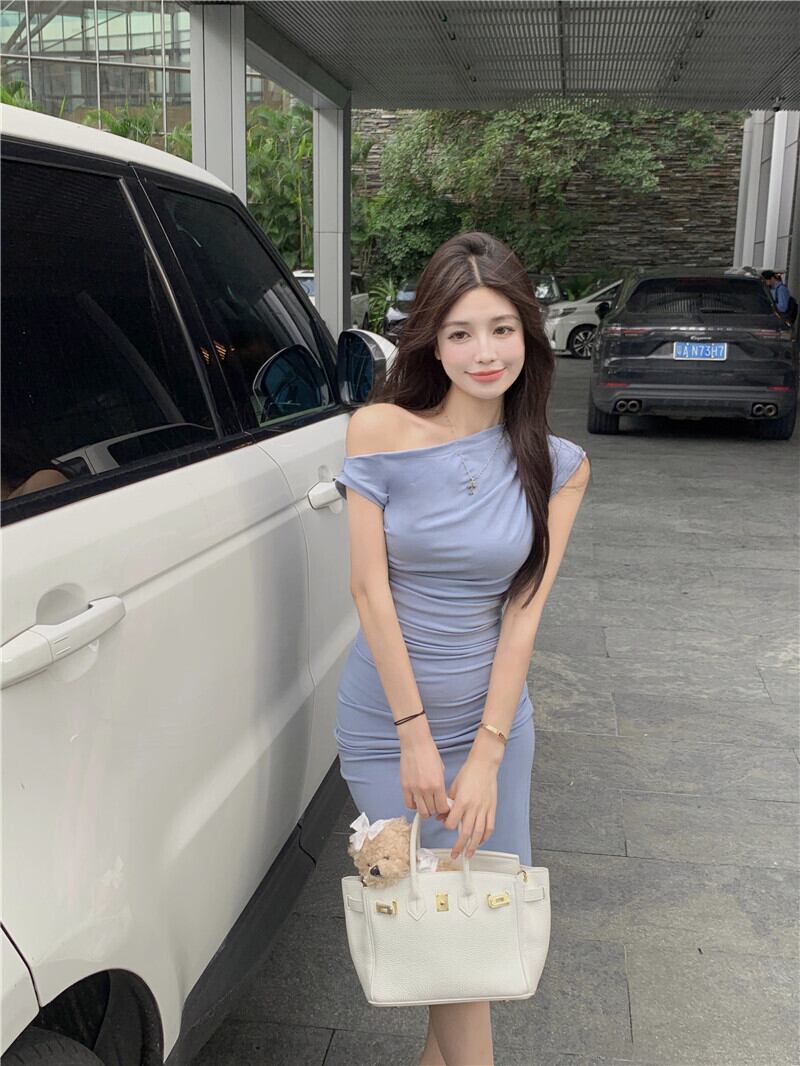 One-shoulder pleated waist and slim slanted shoulder bag hip dress women's 2022 summer new French long skirt ロング プリーツ サマー 夏物 ショルダーバッグ スカート スリム nana18811382291 | modepoisson