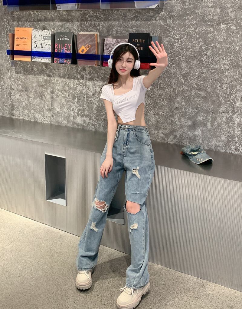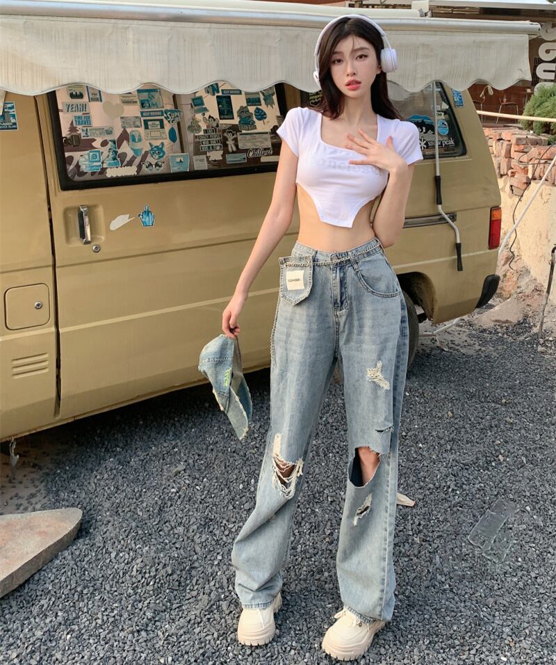 Beggar hole denim trousers ladies summer new high waist loose straight wide leg drape thin pants ハイウェスト サマー 夏物 ワイドレッグ ワイドパンツ nana92585504405 | modepoisson