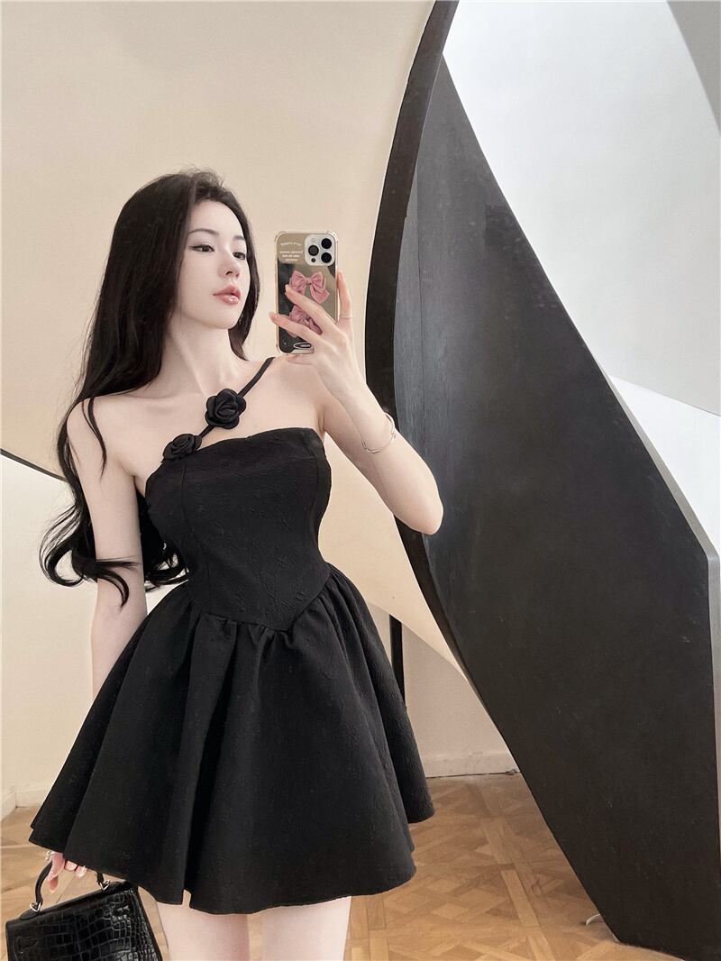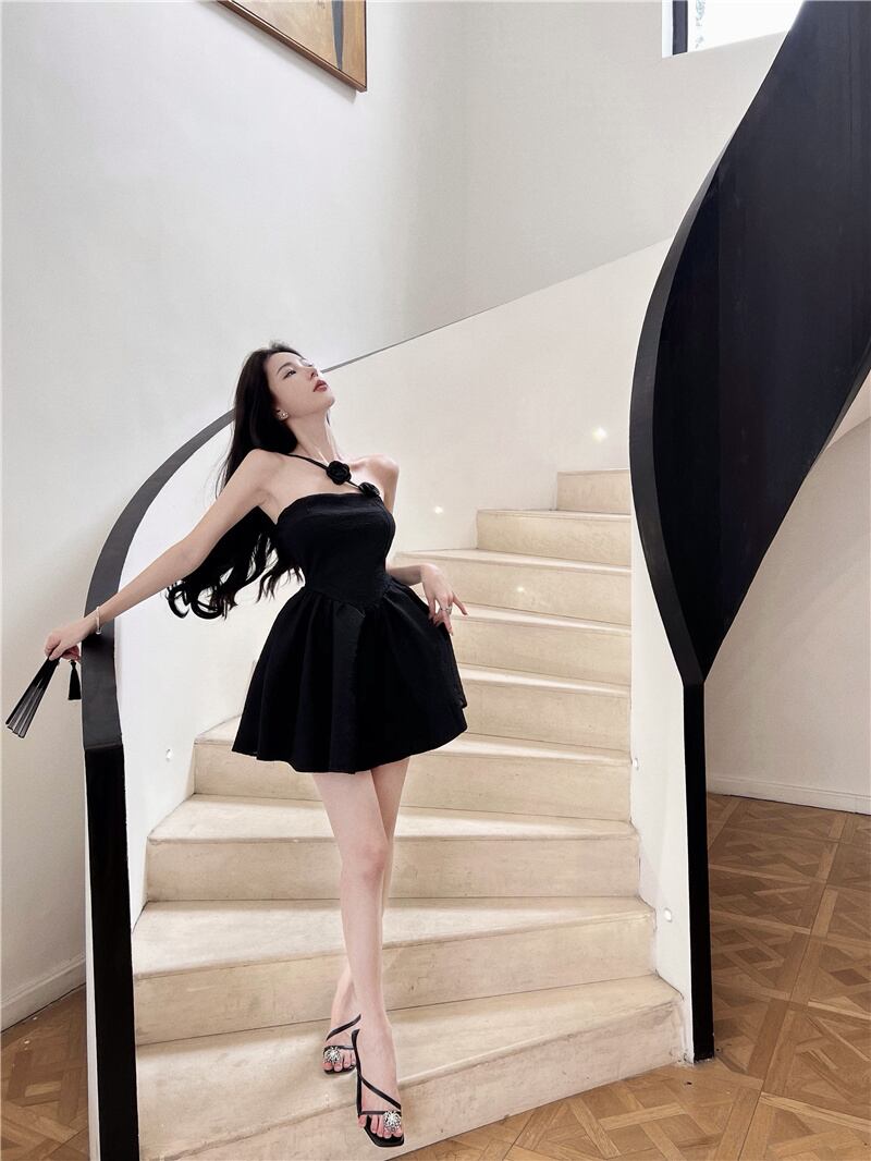 sense halter neck little black dress Hepburn style women's clothing 2022 summer new a-line short skirt tube top dress ショート ブラック サマー 夏物 スカート Aライン nana88874113976 | modepoisson