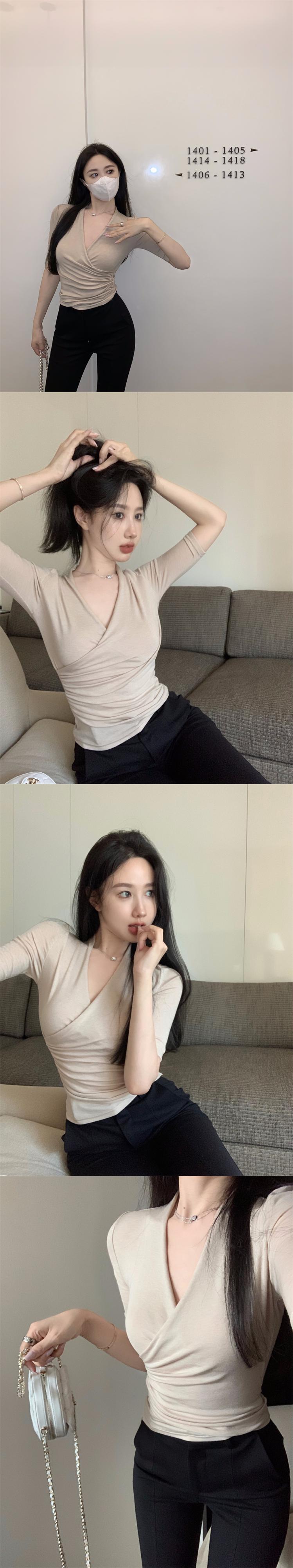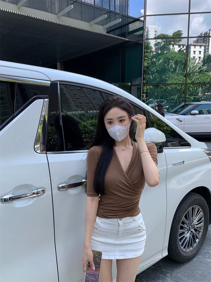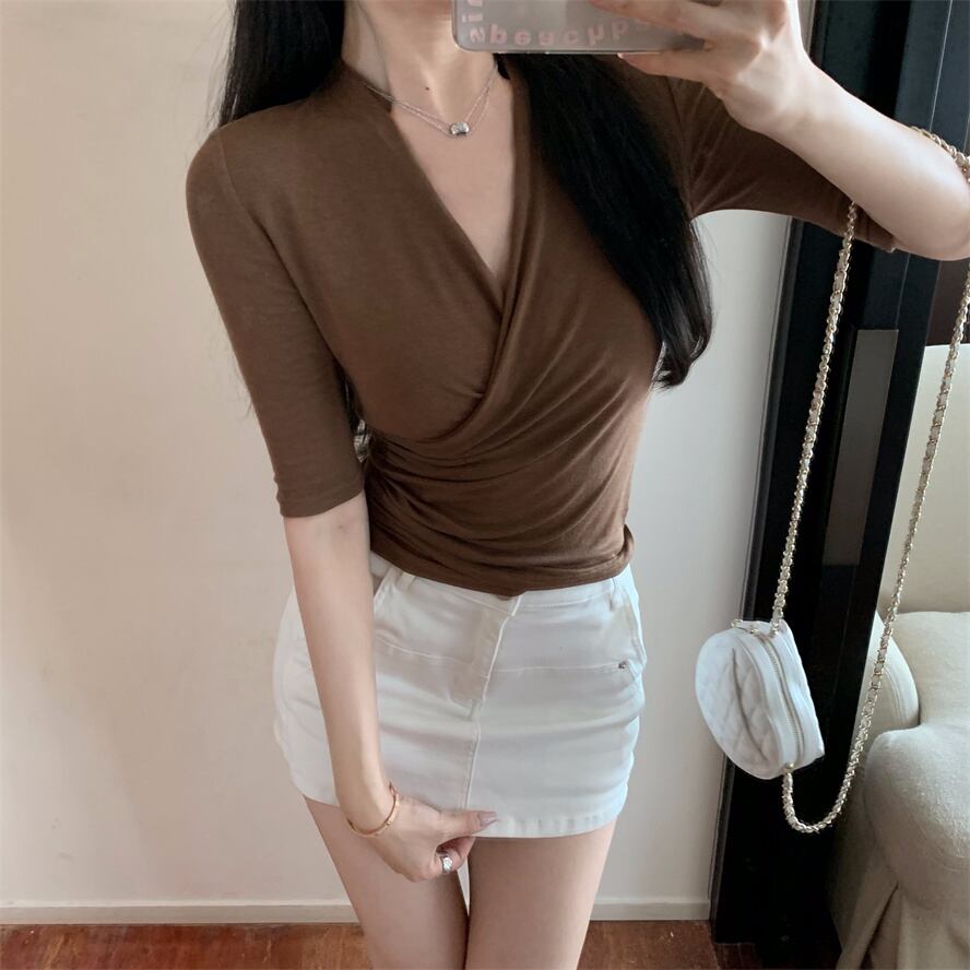 Unique special niche top 2022 summer new design slim v-neck short-sleeved knitted t-shirt women's trend サマー 夏物 Vネック スリム Tシャツ nana50486221029 | modepoisson