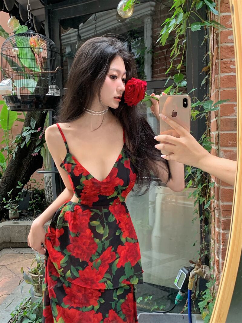Long skirt 2022 summer new French temperament ladies red chiffon floral waist sling dress women's ロング レッド シフォン サマー 夏物 花柄 スカート nana74315920584 | modepoisson
